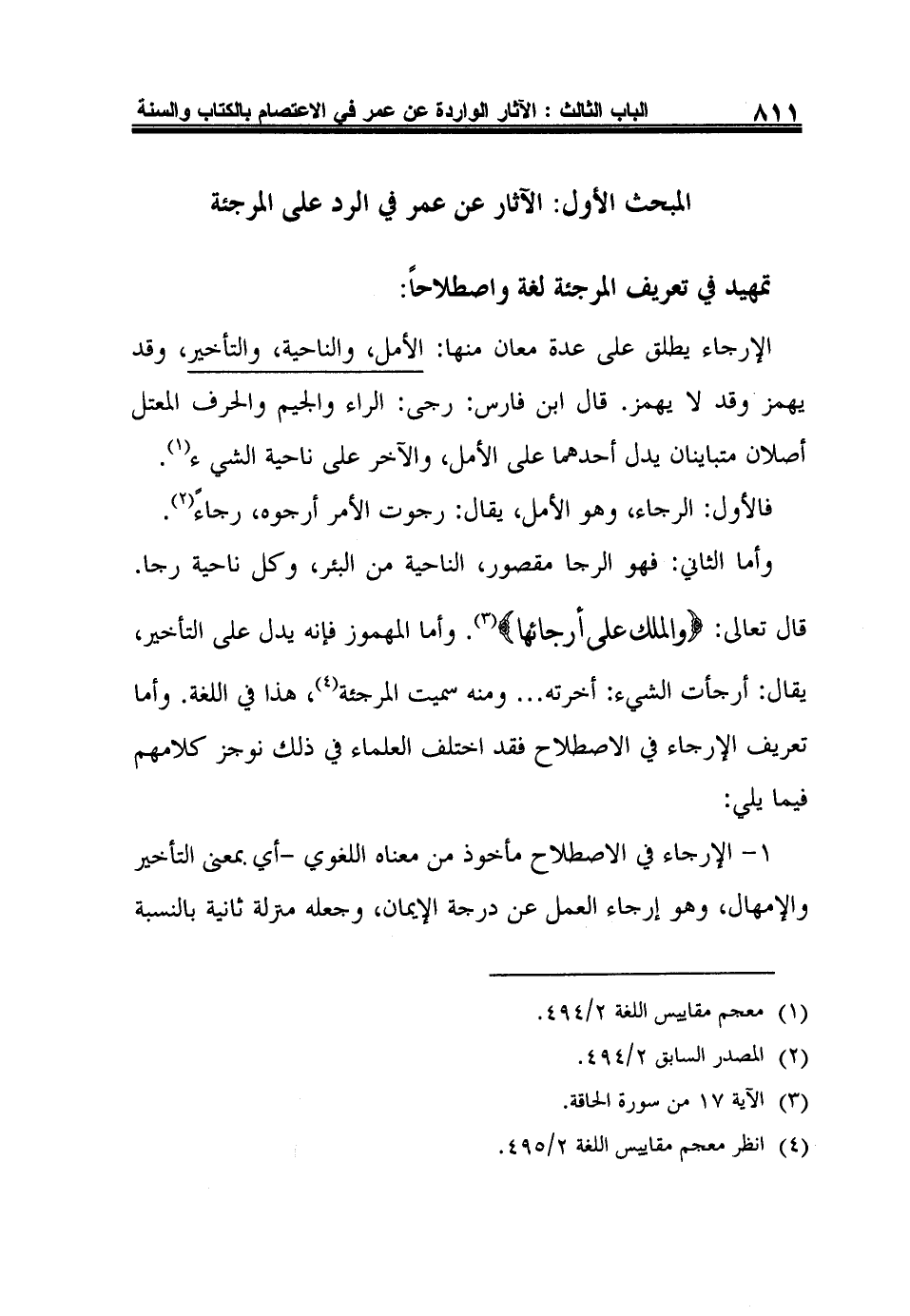 وأما الثاني: فهو الرجا مقصور، الناحية من البئر، وكل ناحية رجا. قال تعالى: {وَالْمَلَكُ عَلَى أَرْجَائِهَا} 3. وأما المهموز فإنه يدل على التأخير، يقال: أرجأت الشيء: أخرته ... ومنه سميت المرجئة4، هذا في اللغة. وأما تعريف الإرجاء في الاصطلاح فقد اختلف العلماء في ذلك نوجز كلامهم فيما يلي: