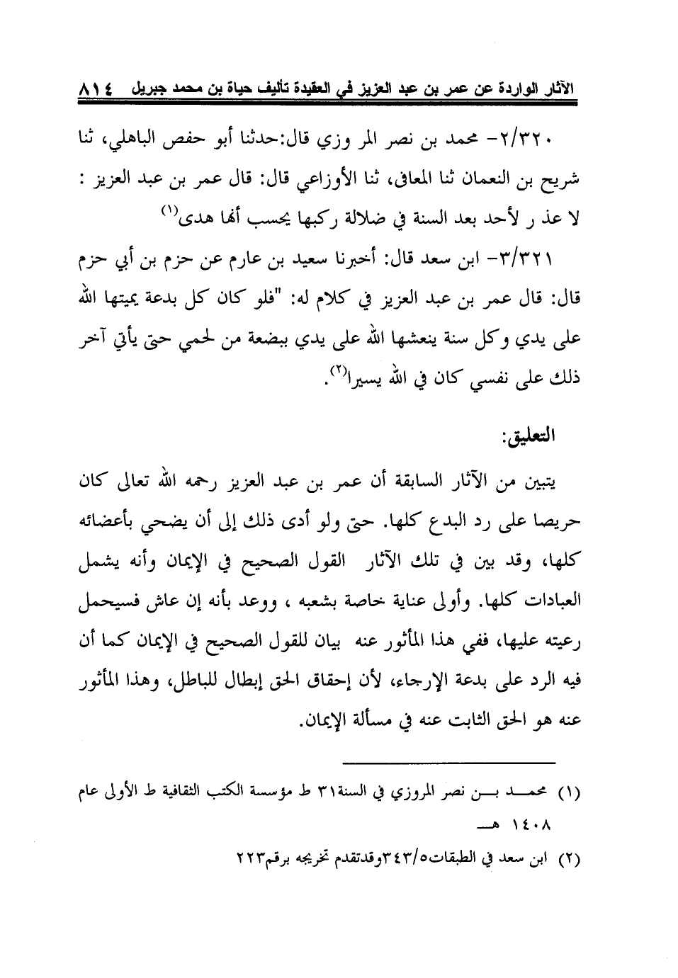 320/2- محمد بن نصر المر وزي قال: حدثنا أبو حفص الباهلي, ثنا شريح بن النعمان ثنا المعافى, ثنا الأوزاعي قال: قال عمر بن عبد العزيز: لا عذ ر لأحد بعد السنة في ضلالة ركبها يحسب أنها هدى1.