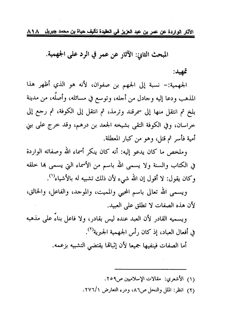المبحث الثاني: الآثار عن عمر في الرد على الجهمية.