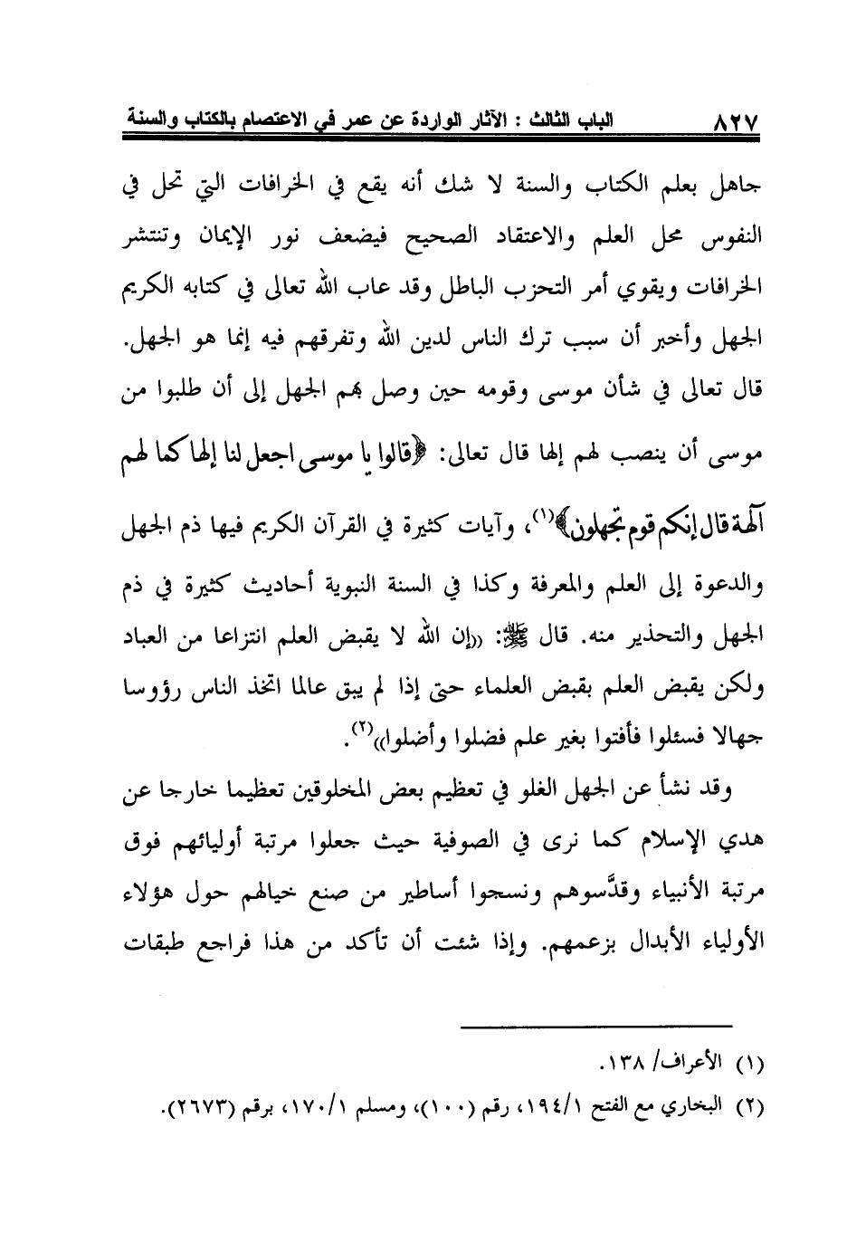 جاهل بعلم الكتاب والسنة لا شك أنه يقع في الخرافات التي تحل في النفوس محل العلم والاعتقاد الصحيح فيضعف نور الإيمان وتنتشر الخرافات ويقوي أمر التحزب الباطل وقد عاب الله تعالى في كتابه الكريم الجهل وأخبر أن سبب ترك الناس لدين الله وتفرقهم فيه إنما هو الجهل. قال تعالى في شأن موسى وقومه حين وصل بهم الجهل إلى أن طلبوا من موسى أن ينصب لهم إلها قال تعالى: {قَالُوا يَا مُوسَى اجْعَلْ لَنَا إِلَهاً كَمَا لَهُمْ آلِهَةٌ قَالَ إِنَّكُمْ قَوْمٌ تَجْهَلُونَ} 1، وآيات كثيرة في القرآن الكريم فيها ذم الجهل والدعوة إلى العلم والمعرفة وكذا في السنة النبوية أحاديث كثيرة في ذم الجهل والتحذير منه. قال صلى الله عليه وسلم: "إن الله لا يقبض العلم انتزاعا من العباد ولكن يقبض العلم بقبض العلماء حتى إذا لم يبق عالما اتخذ الناس رؤوسا جهالا فسئلوا فأفتوا بغير علم فضلوا وأضلوا"2.