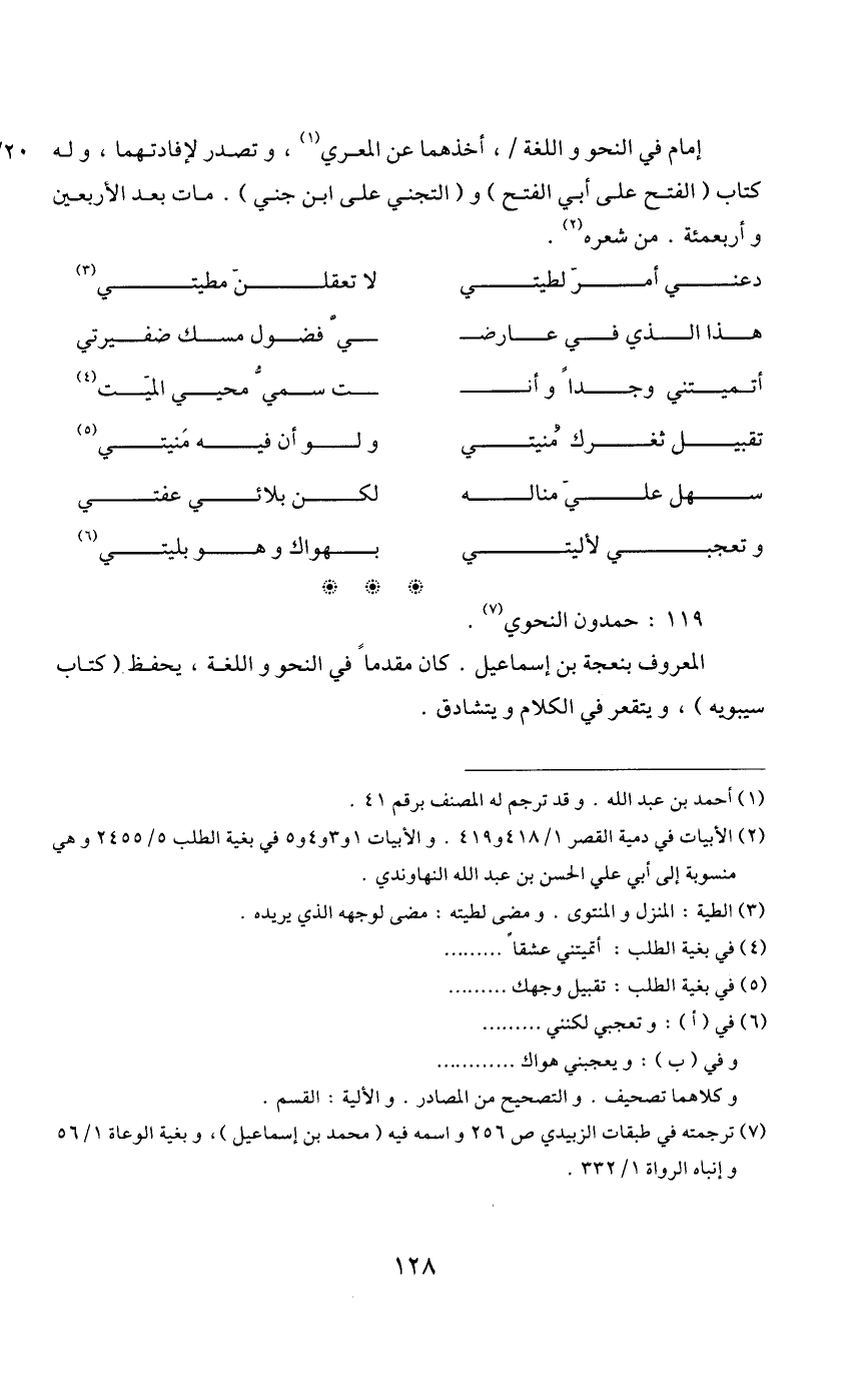 إمام في النحو واللغة، أخذهما عن المعري1، وتصدر لإفادتهما، وله كتاب "الفتح على أبي الفتح" و"التجني على ابن جني". مات بعد الأربعين وأربعمائة. من شعره2.
