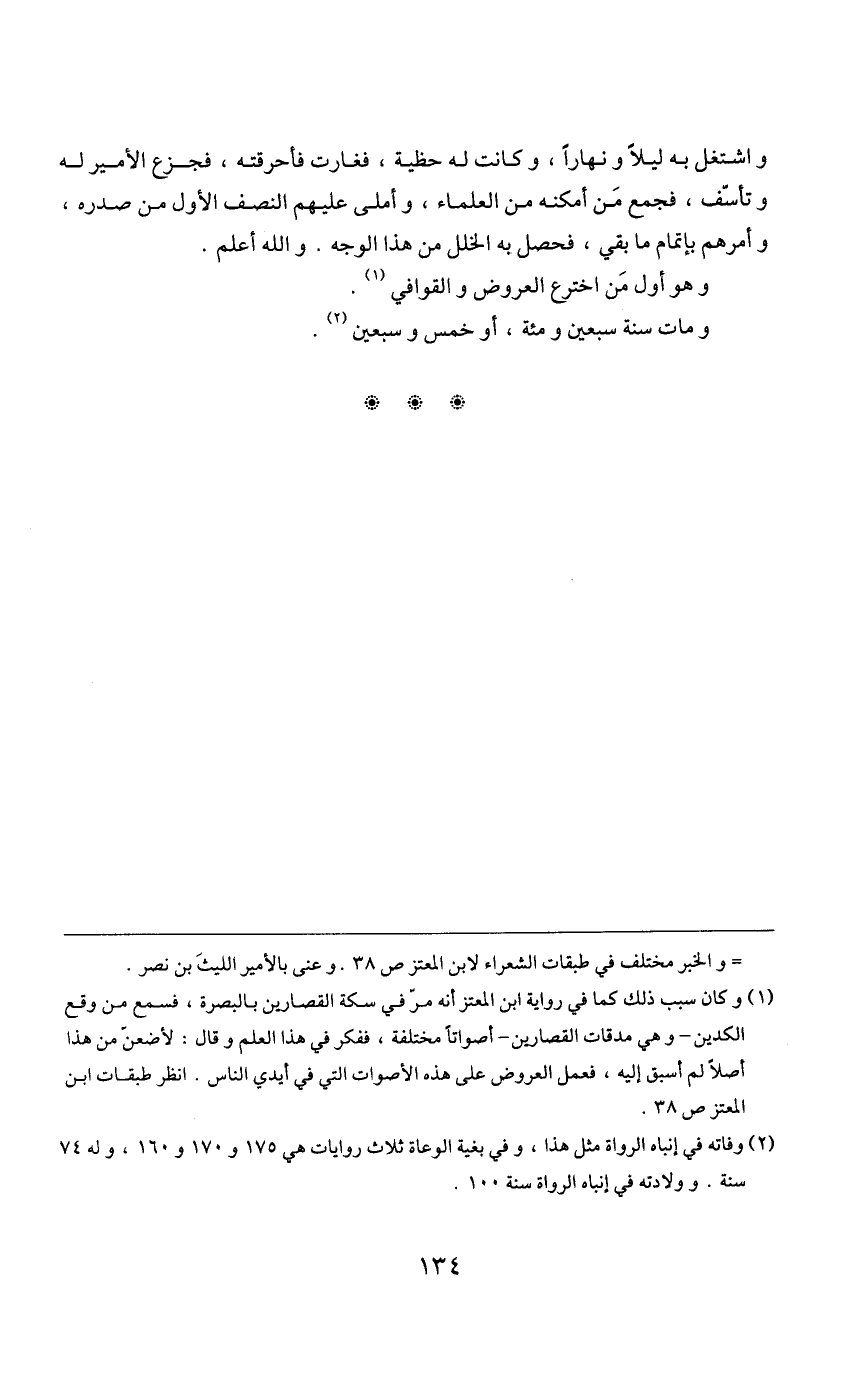 2 وفاته في إنباه الرواة مثل هذا، وفي بغية الوعاة ثلاث روايات هي 175 و170 و160، وله 74 سنة. وولادته في إنباه الرواة سنة 100.