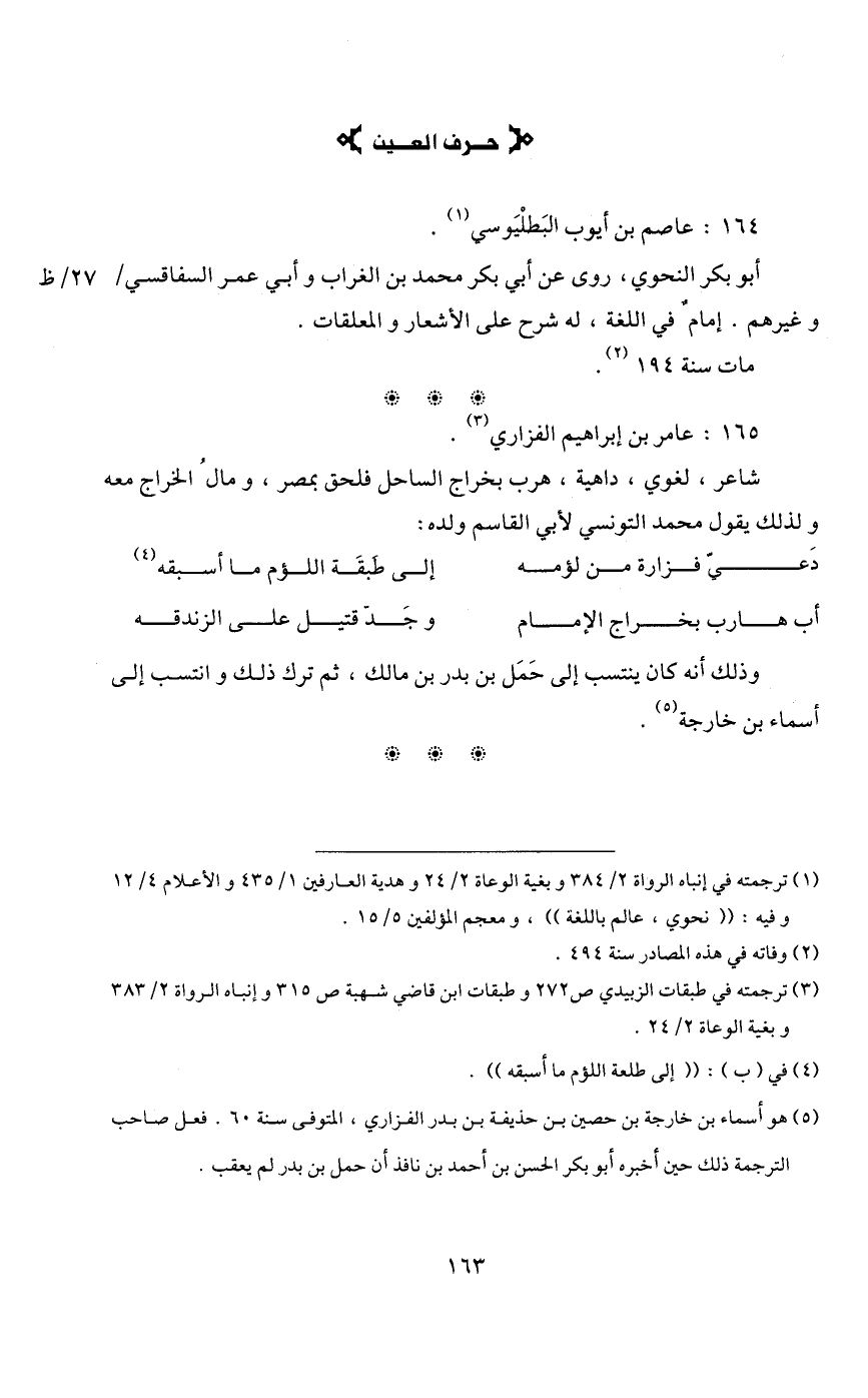 5 هو أسماء بن خارجة بن حصين بن حذيفة بن بدر الفزاري، المتوفى سنة 60. فعل صاحب الترجمة ذلك حين أخبره أبو بكر الحسن بن أحمد بن نافذ أن حمل بن بدر لم يعقب.