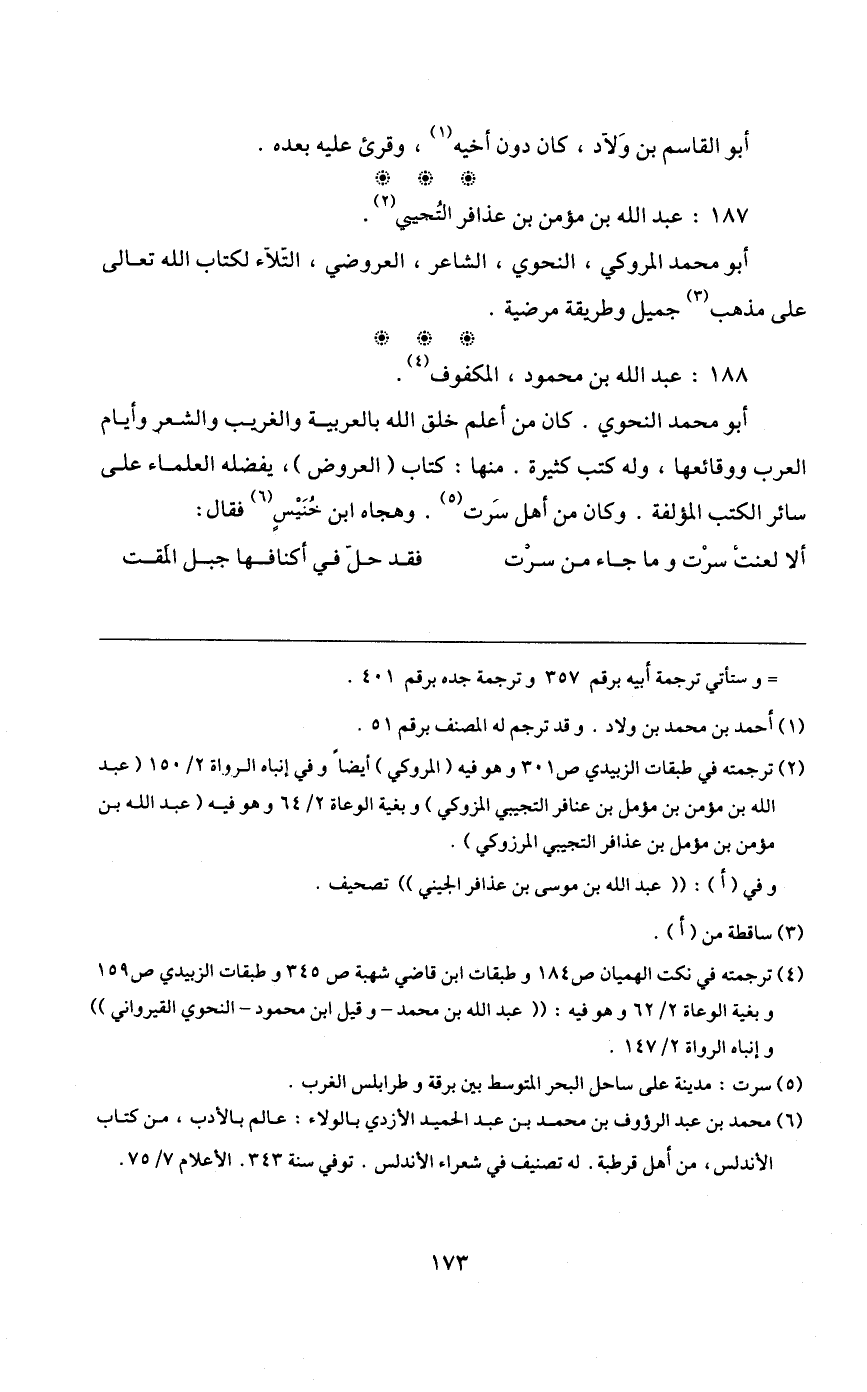 2 ترجمته في طبقات الزبيدي ص301 وهو فيه "المروكي" أيضا وفي إنباه الرواة 2/ 150 "عبد الله بن مؤمن بن مؤمل بن عنافر التجيبي المزوكي" وبغية الوعاة 2/ 64 وهو فيه "عبد الله بن مؤمن بن مؤمل بن عذافر التجيبي المرزوكي".