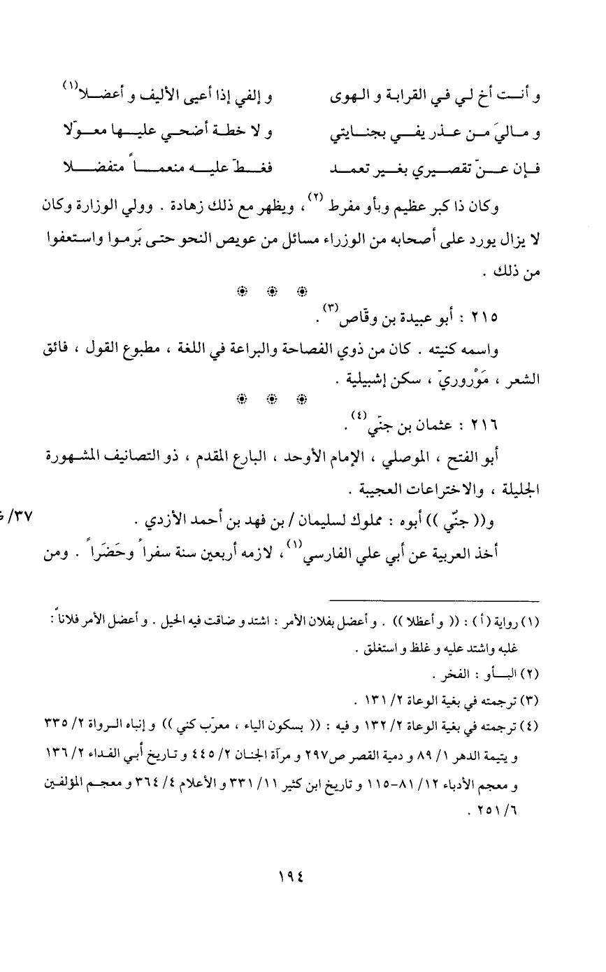 أخذ العربية عن أبي علي الفارسي، لازمه أربعين سنة سفرا وحضرا. ومن