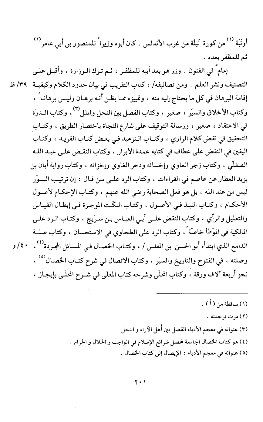 إمام في الفنون. وزر هو بعد أبيه للمظفر، ثم ترك الوزارة، وأقبل على التصنيف ونشر العلم. ومن تصانيفه: كتاب التقريب في بيان حدود الكلام وكيفية إقامة البرهان في كل ما يحتاج إليه منه، وتمييزه مما يظن أنه برهان وليس برهانا، وكتاب الأخلاق والسير، صغير، وكتاب الفصل بين النحل والملل3، وكتاب الدرة في الاعتقاد، صغير، ورسالة التوقيف على شارع النجاة باختصار الطريق، وكتاب التحقيق في نقض كلام الرازي، وكتاب التزهيد في بعض كتاب الفريد، وكتاب اليقين في النقض على عطاف في كتابه عمدة الأبرار، وكتاب النقض على عبد الله الصقلي، وكتاب زجر العاوي وإخسائه ودحر الغاوي وإخزائه، وكتاب رواية أبان بن يزيد العطار عن عاصم في القراءات، وكتاب الرد على من قال: إن ترتيب السور ليس من عند الله، بل هو فعل الصحابة رضي الله عنهم، وكتاب الإحكام لأصول الأحكام، وكتاب النبذ في الأصول، وكتاب النكت الموجزة في إبطال القياس والتعليل والرأي وكتاب النقض على أبي العباس بن سريج، وكتاب الرد على المالكية في الموطأ خاصة، وكتاب الرد على الطحاوي في الاستحسان، وكتاب صلة الدامع الذي ابتدأه أبو الحسن بن المفلس، وكتاب الخصال في المسائل المجردة4، وصلته، في الفتوح والتاريخ والسير، وكتاب الاتصال في شرح كتاب الخصال5، نحو أربعة آلاف ورقة، وكتاب المحلي وشرحه كتاب المعلي في شرح المحلي بإيجاز.