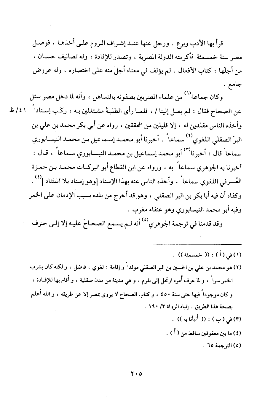 2 هو محمد بن علي بن الحسين بن البر الصقلي مولدا وإقامة: لغوي، فاضل، ولكنه كان يشرب الخمر سرا، ولما عرف أمره ارتحل إلى بلرم. وهي مدينة من مدن صقلية. وأقام بها اللإفادة، وكان موجودا فيها حتى سنة 450، وكتاب الصحاح لا يروي بمصر إلا عن طريقه، والله أعلم بصحة هذا الطريق. إنباه الرواة 3/ 190.