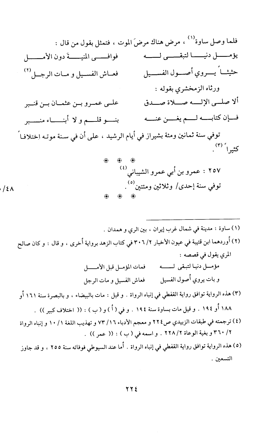 3 هذه الرواية توافق رواية القفطي في إنباه الرواة. وقيل: مات بالبيضاء، وبالبصرة سنة 161 أو 188 أو 194 وقبل مات بساوة سنة 194، وفي "أ" و"ب": "اختلاف كبير".