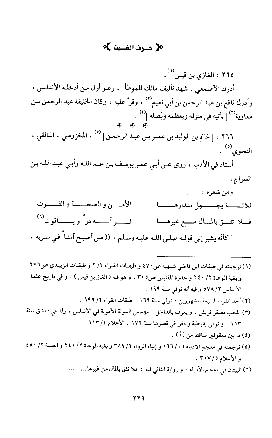 1 ترجمته في طبقات ابن قاضي شهبة ص470 وطبقات القراء 2/ 2 وطبقات الزبيدي ص276 وبغية الوعاة 2/ 240 وجذوة المقتبس ص305، وهو فيه "الغاز بن قبس". وفي تاريخ علماء الأندلس 2/ 578 وفيه أنه توفي سنة 199.