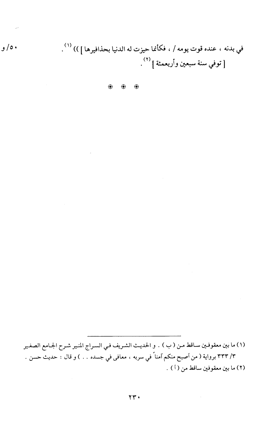 1 ما بين معقوفين ساقط من "ب". والحديث الشريف في السراج المنير شرح الجامع الصغير 3/ 333 برواية "من أصبح منكم آمنا في سربه، معافي في جسده ... " وقال: حديث حسن.