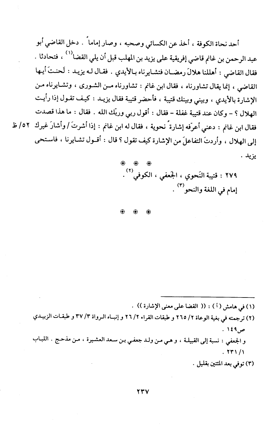 أحد نحاة الكوفة، أخذ عن الكسائي وصحبه، وصار إماما، دخل القاضي أبو عبد الرحمن بن غانم قاضي إفريقية على يزيد بن المهلب قبل أن يلي القضا1، فتحادثا. فقال القاضي: أهلنا هلال رمضان فتشا يرناه بالأيدي. فقال له يزيد: لحنت أيها القاضي، إنما يقال تشاورناه، فقال ابن غانم: تشاورناه من الشوري، وتشايرناه من الإشارة بالأيدي، وبيني وبينك قتيبة، فأحضر قتيبة فقال يزيد، كيف تقول إذا رأيت الهلال؟ وكان عند قتيبة غفلة فقال: أقول ربي وربك الله. فقال: ما هذا قصدت فقال ابن غانم: دعني أعرفه إشارة نحوية، فقال له ابن غانم: إذا أشرت وأشار غيرك إلى الهلال، وأردت التفاعل من الإشارة كيف تقول؟ قال: أقول تشايرنا، فاستحى يزيد.