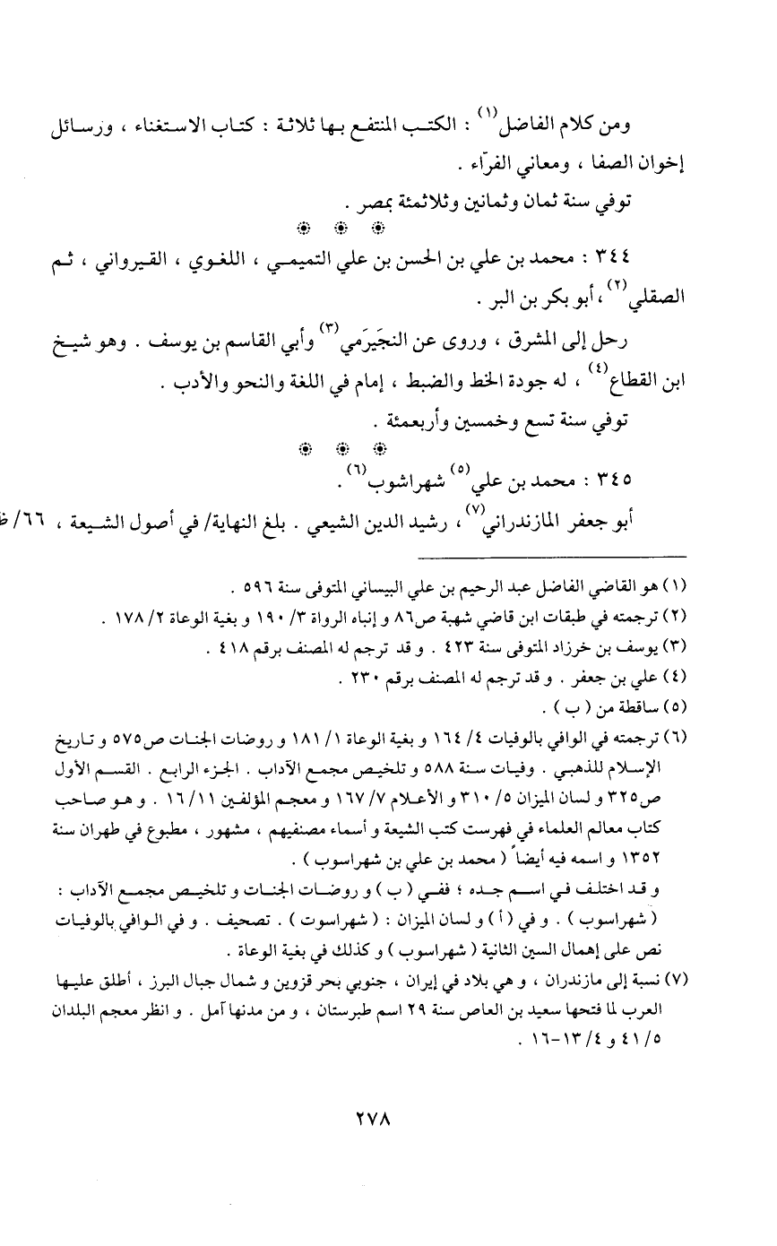6 ترجمته في الوافي بالوفيات 4/ 164 وبغية الوعاة 1/ 181 وروضات الجنات ص575 وتاريخ الإسلام للذهبي. وفيات سنة 588 وتلخيص مجمع الآداب. الجزء الرابع. القسم الأول ص325 ولسان الميزان 5/ 310 والأعلام 7/ 167 ومعجم المؤلفين 11/ 16. وهو صاحب كتاب معالم العلماء في فهرست كتب الشيعة وأسماء مصنفيهم، مشهور، مطبوع في طهران سنة 1352 واسمه فيه أيضا "محمد بن علي بن شهراسوب".