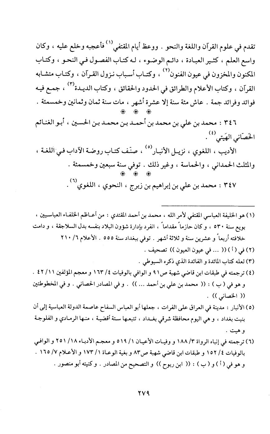 1 هو الخليفة العباسي المقتفي لأمر الله، محمد بن أحمد المقتدي، من أعاظم الخلفاء العباسيين، بويع سنة 530، وكان حازما مقداما، انفرد بإدارة شئون البلاد بنفسه بدل السلاجقة، ودامت خلافته أربعا وعشرين سنة وثلاثة أشهر. توفي ببغداد سنة 555. الأعلام 6/ 210.