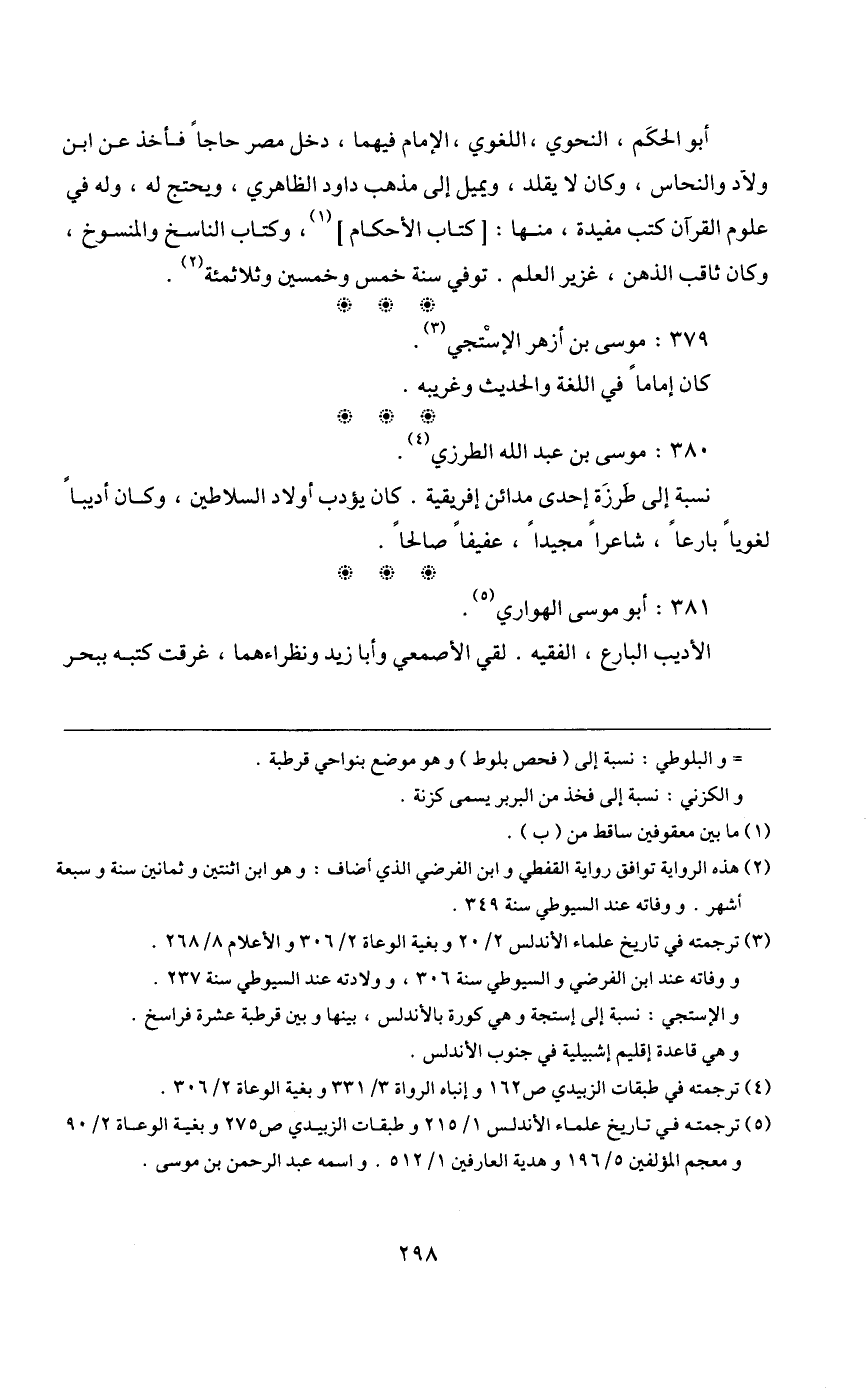 5 ترجمته في تاريخ علماء الأندلس 1/ 215 وطبقات الزبيدي ص275 وبغية الوعاة 2/ 90 ومعجم المؤلفين 5/ 196 وهدية العارفين 1/ 512. واسمه عبد الرحمن بن موسى.