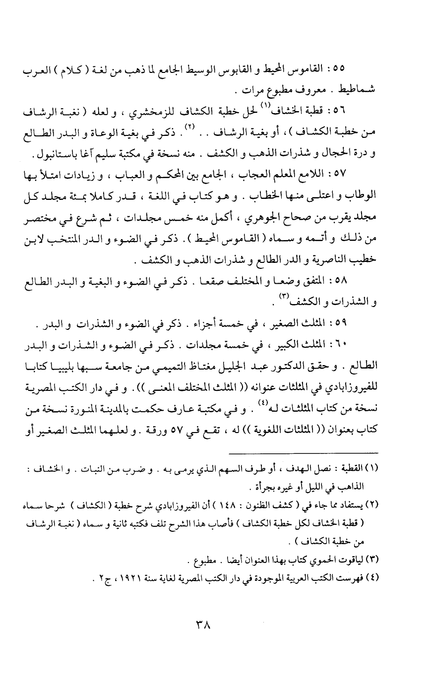 65- قطبة الخشاف1 لحل خطبة الكشاف للزمخشري، ولعله "نغبة الرشاف من خطبة الكشاف"، أو بغية الرشاف..2 ذكر في بغية الوعاة والبدر الطالع ودره الحجال وشذرات الذهب والكشف. منه نسخة في مكتبة سليم آغا بإستانبول.