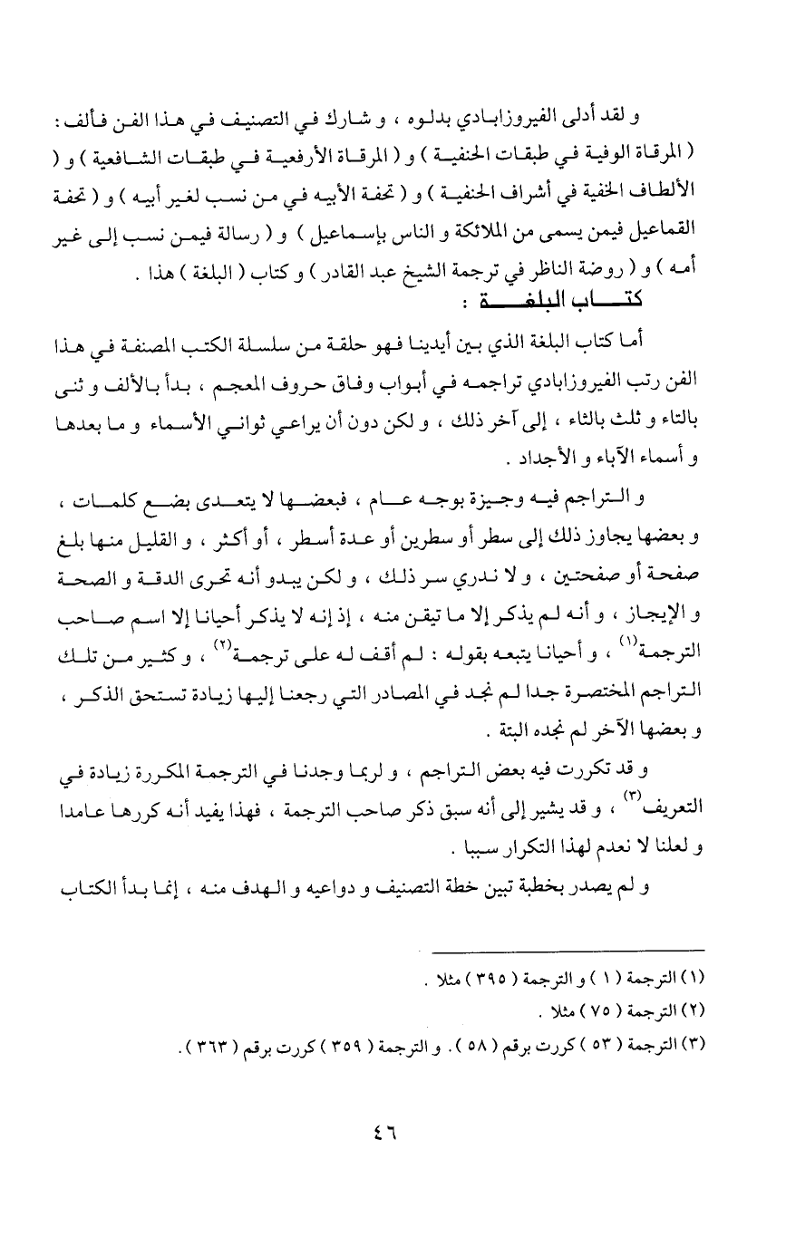 أما كتاب البلغة الذي بين أيدينا فهو حلقة من سلسلة الكتب المصنفة في هذا الفن رتب الفيروزآبادي تراجمه في أبواب وفاق حروق المعجم. بدأ بالألف وثنى بالتاء وثلث بالثاء، إلى آخر ذلك، ولكن دون أن يراعي ثواني الأسماء وما بعدها وأسماء الآباء والأجداد.