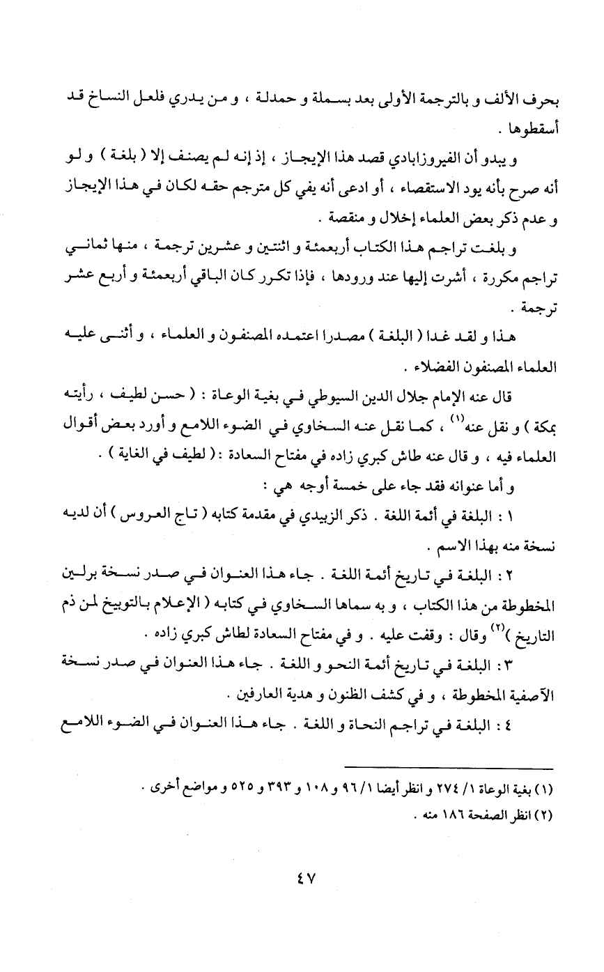 ويبدو أن الفيروزآبادي قصد هذا الإيجاز؛ إذ إنه لم يصنف إلا "بلغة" ولو أنه صرح بأنه يود الاستقصاء، أو ادعى أنه يفي كل مترجم حقه لكان في هذا الإيجاز وعدم ذكر بعض العلماء إخلال ومنقصة.