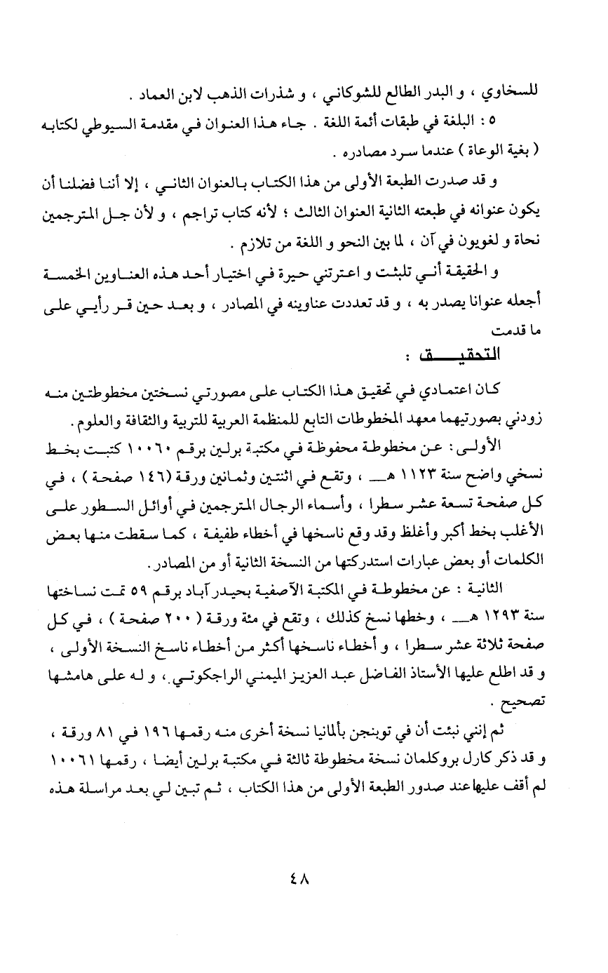 ثم إنني نبئت أن في توبنجن بألمانيا نسخة أخرى منه رقمها 196 في 81 ورقة، وقد ذكر كارل بروكلمان نسخة مخطوطة ثالثة في مكتبة برلين أيضا، رقمها 10061 لم أقف عليها عند صدور الطبعة الأولى من هذا الكتاب، ثم تبين لي بعد مراسلة هذه