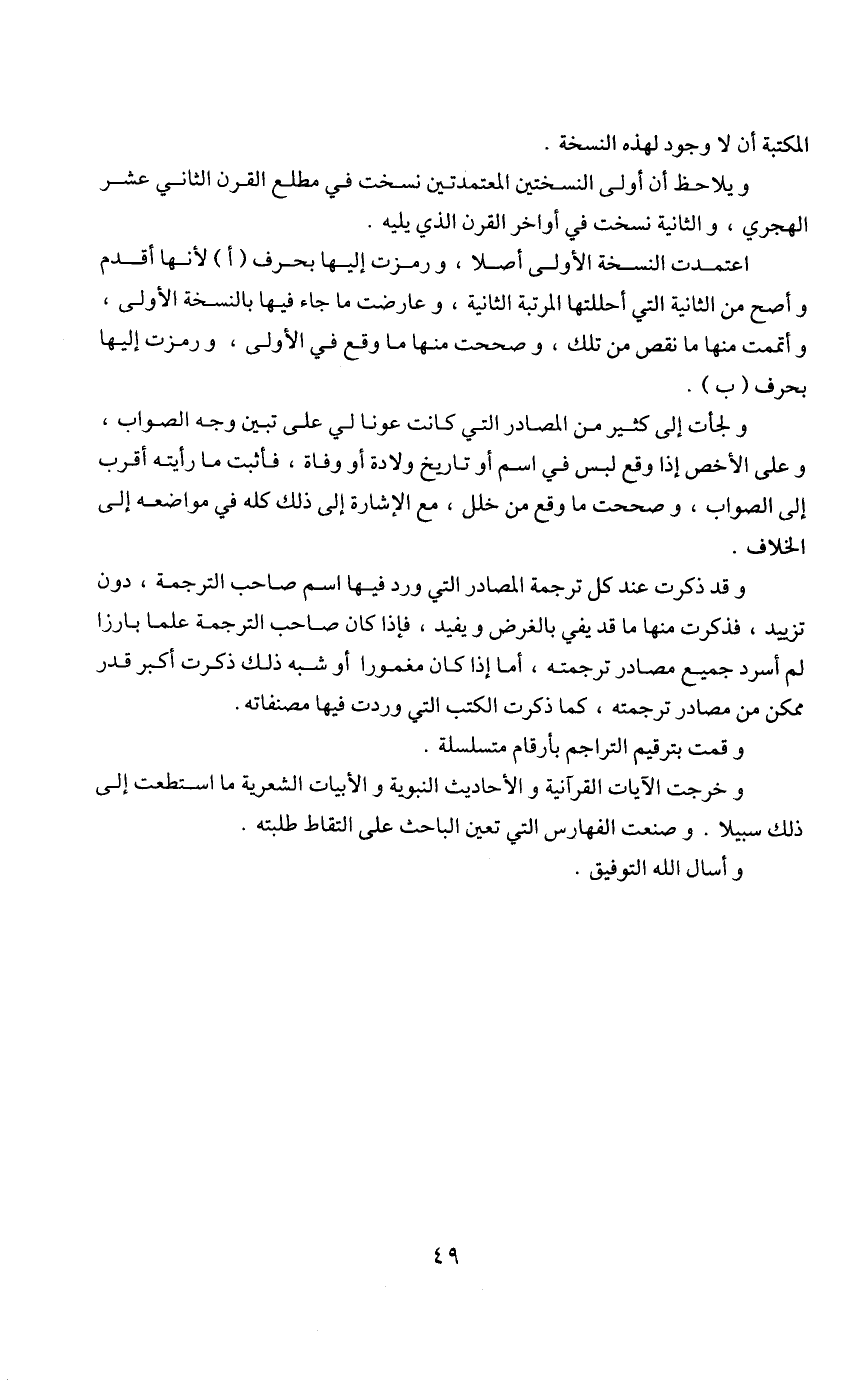 ولجأت إلى كثير من المصادر التي كانت عونا لي على تبين وجه الصواب، وعلى الأخص إذا وقع لبس في اسم أو تاريخ ولادة أو وفاة، فأثبت ما رأيته أقرب إلى الصواب، وصححت ما وقع من خلل، مع الإشارة إلى ذلك كله في مواضعه إلى الخلاف.