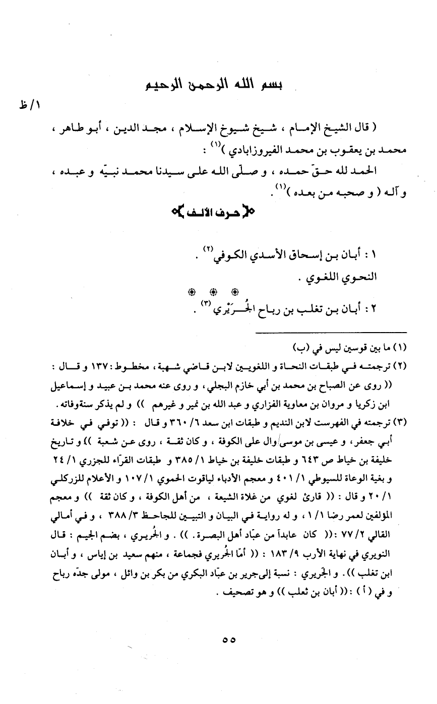 3 ترجمته في الفهرست لابن النديم وطبقات ابن سعد 6/ 360 وقال: "توفي في خلافة أبي جعفر، وعيسى بن موسى وال على الكوفة، وكان ثقة، روى عن شعبة" وتاريخ خليفة بن خياط ص643 وطبقات خليفة بن خياط 1/ 385 وطبقات القراء للجزري 1/ 24 وبغية الوعاء للسيوطي 1/ 401 ومعجم الأدباء لياقوت الحموي 1/ 107 والأعلام للزركلي 1/ 20 وقال: "قارئ لغوي من غلاة الشيعة، من أهل الكوفة، وكان ثقة" ومعجم المؤلفين لعمر رضا 1/ 1، وله رواية في البيان والتبيين للجاحظ 3/ 388، وفي أمالي القالي 2/ 77: "كان عابدا من عباد أهل البصرة.". والجريرى، بضم الجيم، قال النويري في نهاية الأرب 9/ 183: "أما الجريري فجماعة، منهم سعيد بن إياس، وأبان بن تغلب". والجريرى: نسبة إلى جرير بن عباد البكري من بكر بن وائل، مولى جدة رباح وفي "أ": "أبان بن ثعلب" وهو تصحيف.