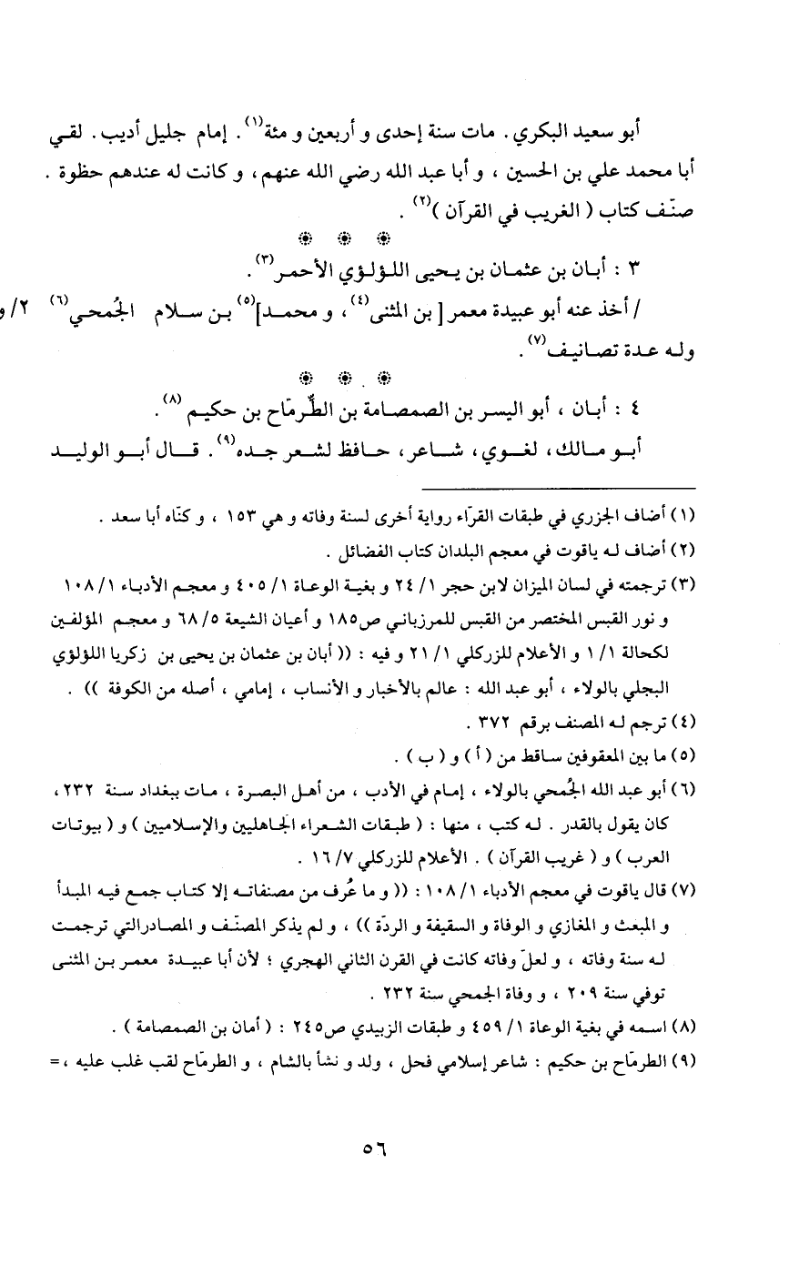 6 أبو عبد الله الجمحي بالولاء، إمام في الأدب، من أهل البصرة، مات ببغداد سنة 232، كان يقول بالقدر. له كتب، منها: "طبقات الشعراء الجاهليين والإسلاميين" و"بيوتات العرب" و"غريب القرآن". الأعلام للزركلي 7/ 16.