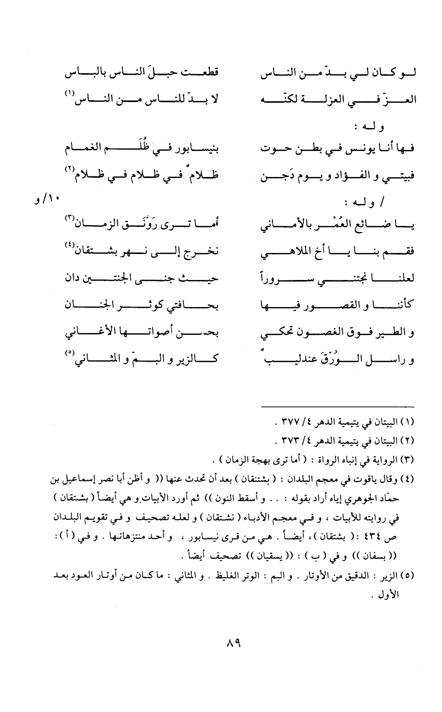 4 وقال ياقوت في معجم البلدان: "بشتنقان بعد أن تحدث عنها "وأظن أبا نصر إسماعيل بن حماد الجوهري إياه أراد بقوله: ... وأسقط النون ثم أورد الأبيات وهي أيضا "بشتقان" في روايته للأبيات، وفي معجم الأدباء "نشتقان" ولعله تصحيف وفي تقويم البلدان ص434: "بشتقان"، أيضا. هي من قري نيسابور، واحد منتزهاتها. وفي "أ": "بسفان" وفي "ب": "يسقيان" تصحيف أيضا.