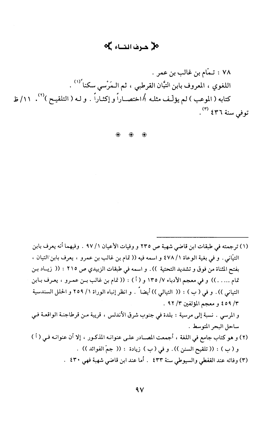 1 ترجمته في طبقات ابن قاضي شهبة ص235 ووفيات الأعيان 1/ 97. وفيهما أنه يعرف بابن التياني. وفي بغية الوعاة 1/ 478 واسمه فيه "تمام بن غالب بن عمرو، يعرف بابن التيان، بفتح المثناة من فوق وتشديد التحتية". واسمه في طبقات الزبيدي ص215: "زياد بن تمام ... " وفي معجم الأدباء 7/ 135 و"أ": "تمام بن غالب بن عمرو، يعرف بابن التياني". وفي "ب": "التيالي" أيضا. وانظر إنباه الوراة 1/ 259 والحلل السندسية 3/ 459 ومعجم المؤلفين 3/ 92.