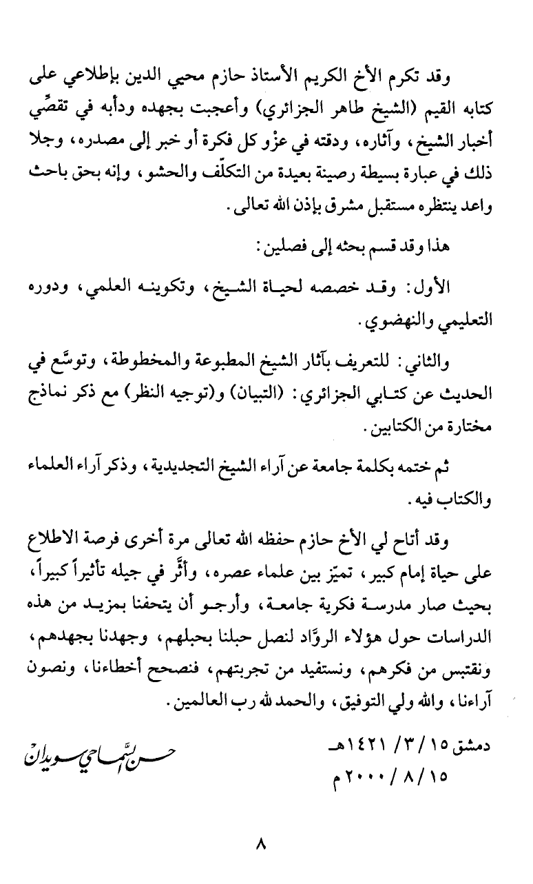 كتابه القيم (الشيخ طاهر الجزائري) واعجبت بجهده ودأبه في تقصي