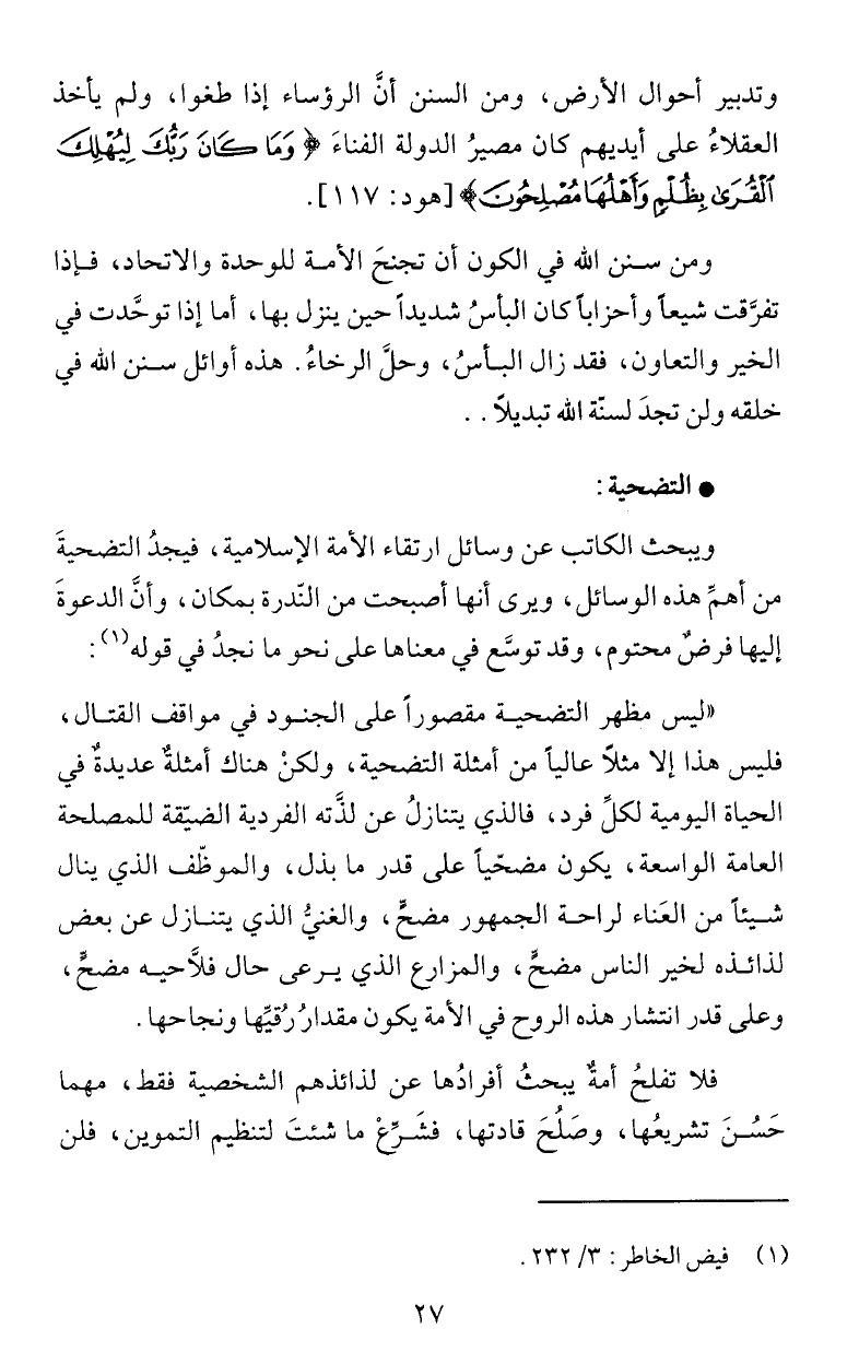 ويبحث الكاتب عن وسائل ارتقاء الأمة الإسلامية، فيجدُ التضحيةَ