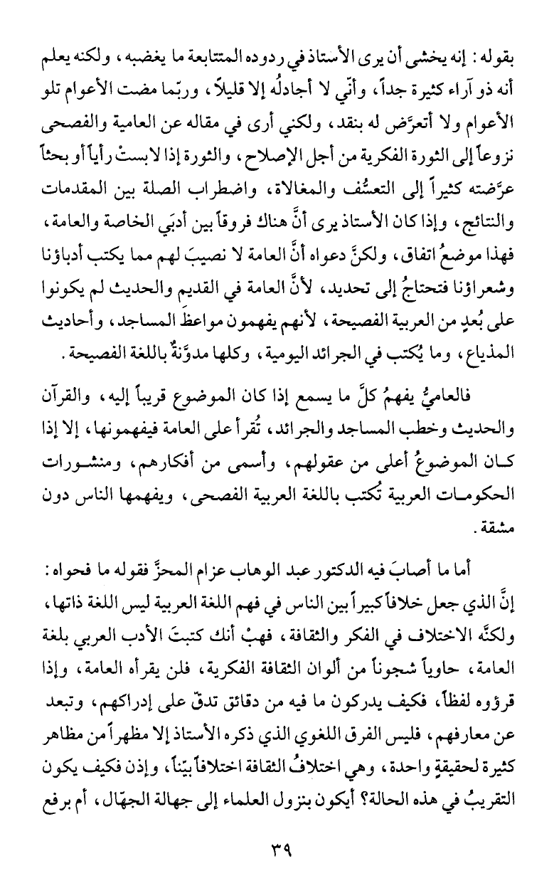 الأعوام ولا أتعرَّض له بنقد، ولكني أرى في مقاله عن العامية والفصحى