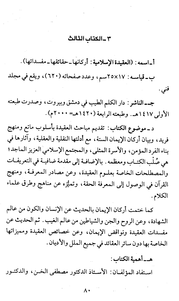 ا- اسمه: (العقيدة ا لإسلامية: أركانها - حقائقها - مفسدا تها).