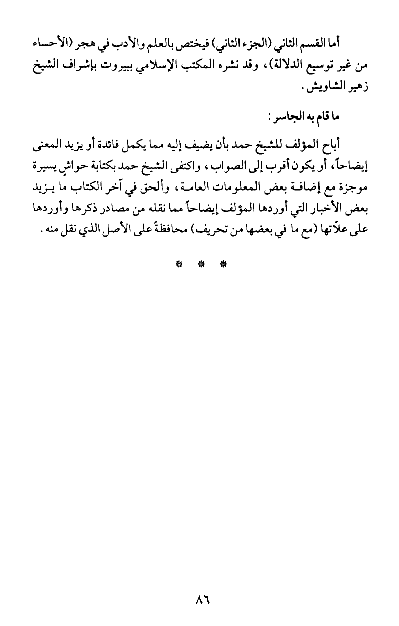 أما القسم الثاني (الجزء الثاني) فيختص بالعلم والأدب في هجر (الأحساء