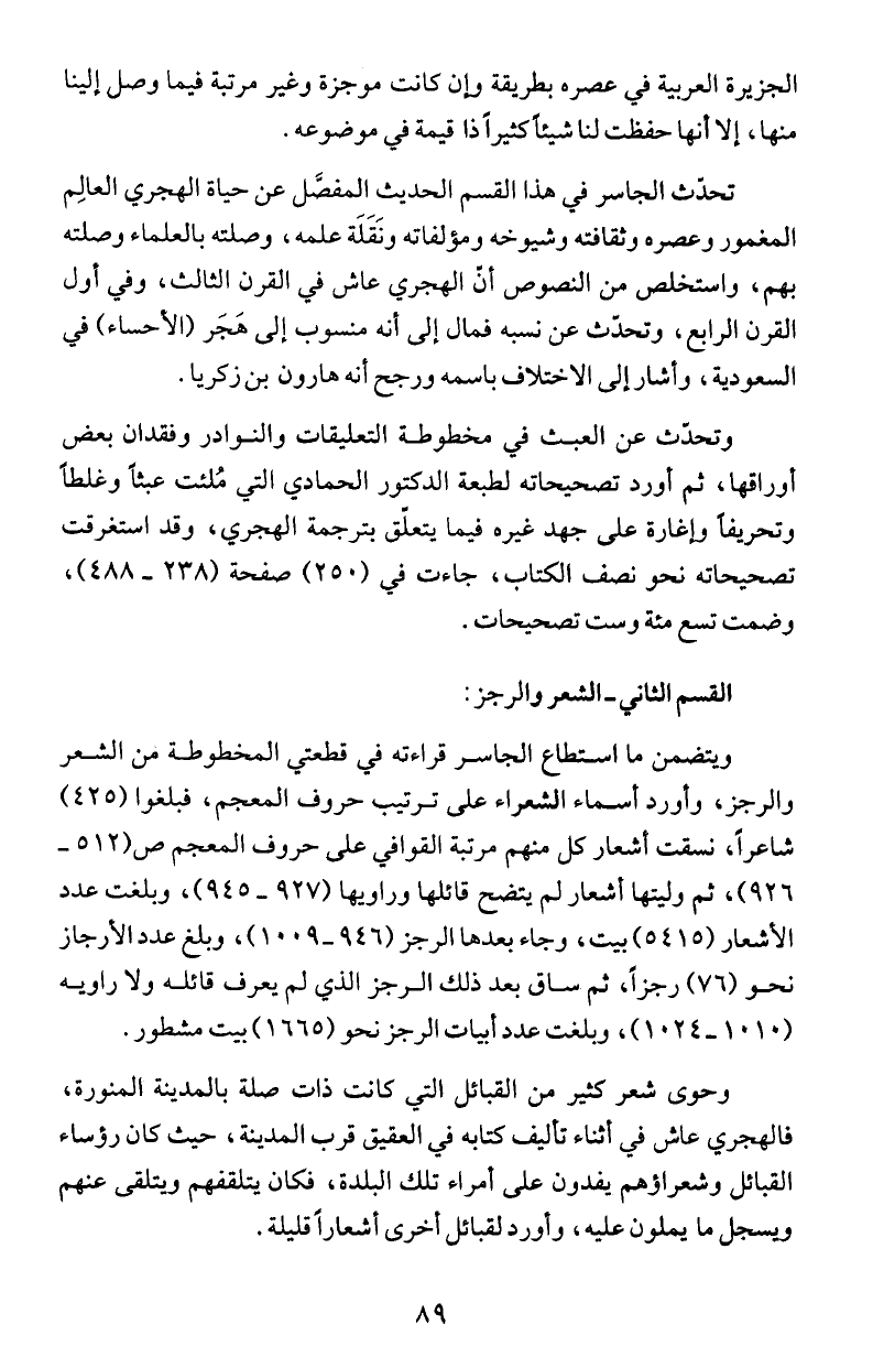 القرن الرابع، وتحدث عن نسبه فمال إلى أنه منسوب إلى هَجَر (الأحساء) في