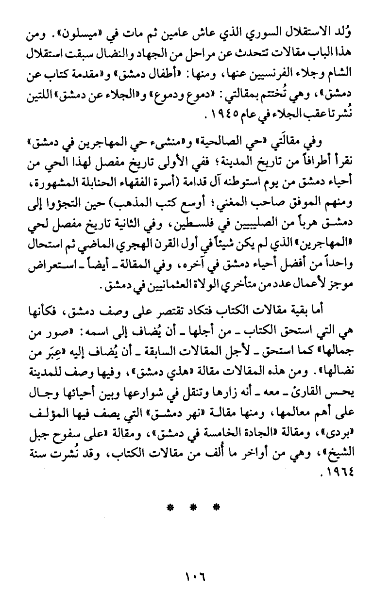 دمشق "، وهي تُختتم بمقالتي ة "دموع ودموع " و"الجلاء عن دمشق " اللتين