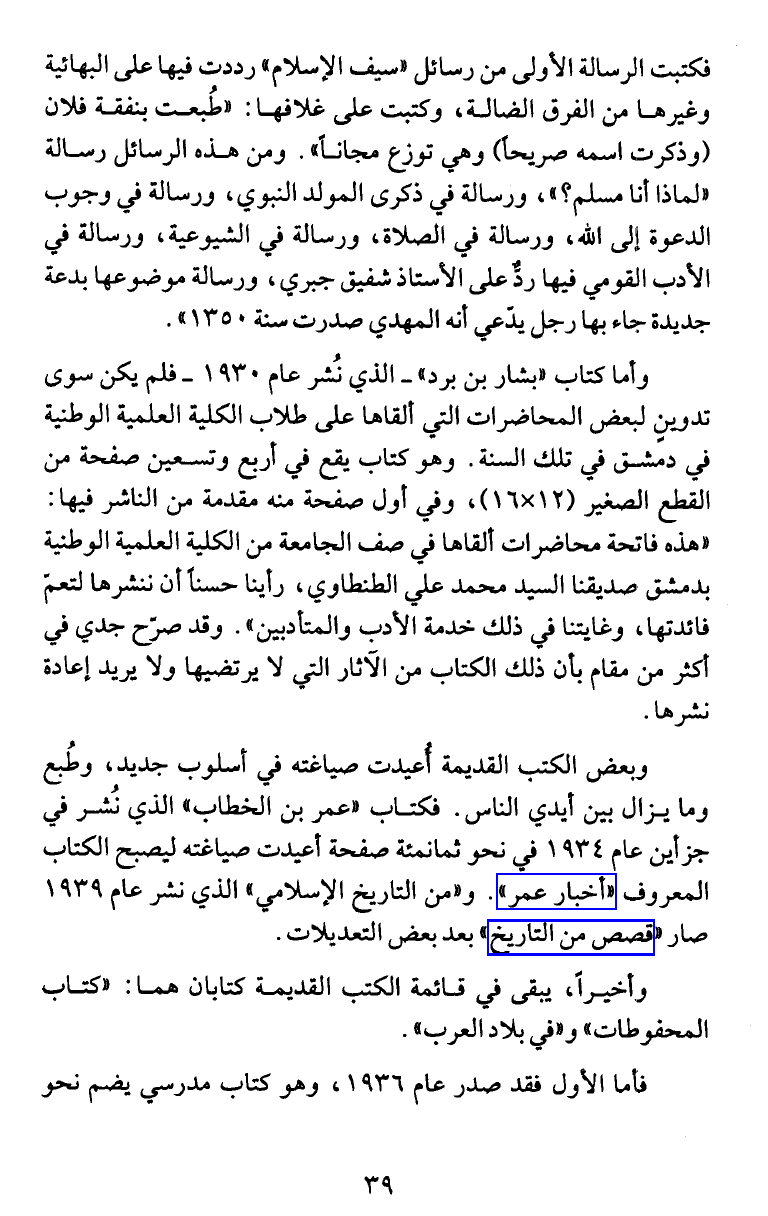 المعروف "اخبار عمر". و"من التاريخ الإسلامي " الذي نشر عام 1939