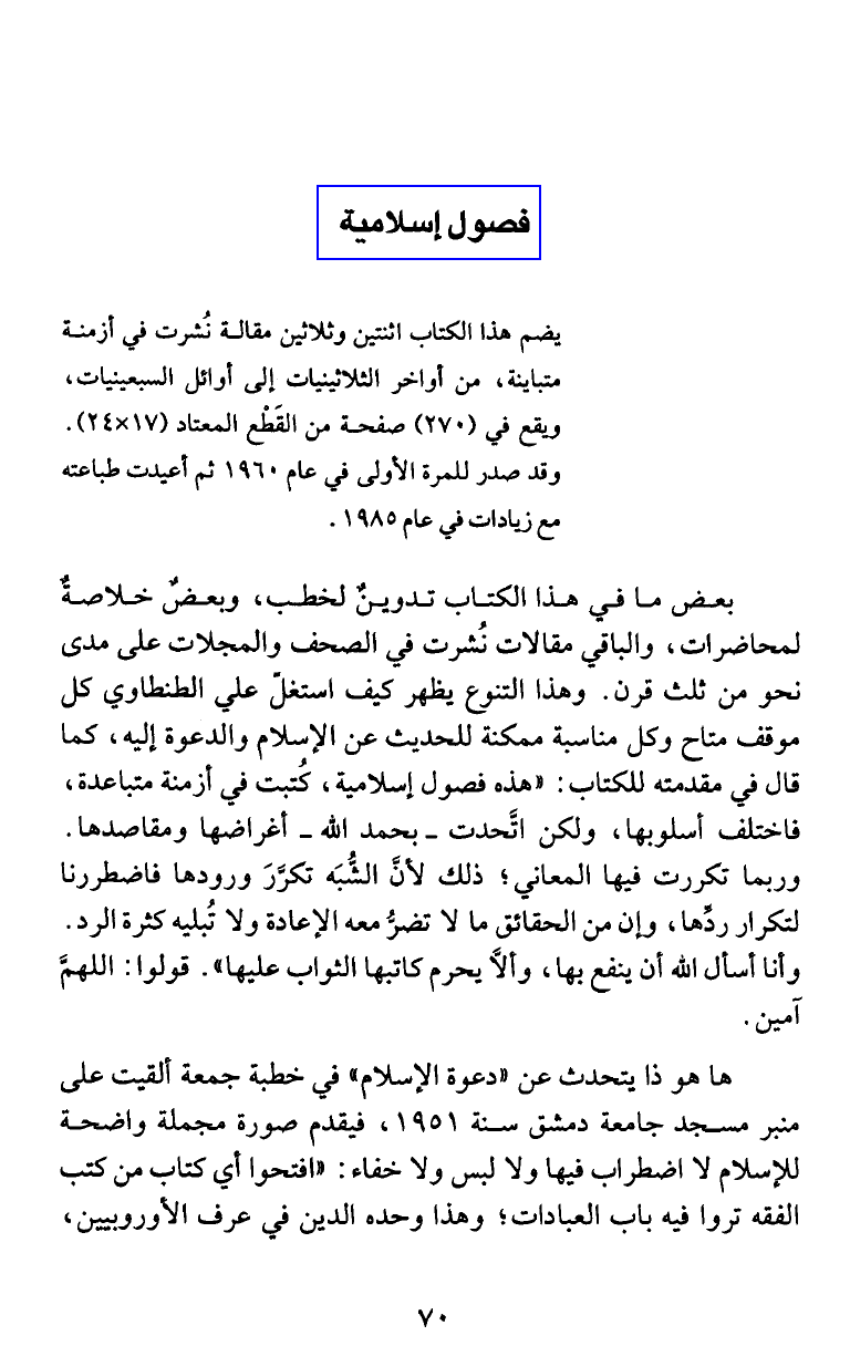قال في مقدمته للكتاب: "هذه فصول إسلامية، كُتبت في ازمنة متباعدة،