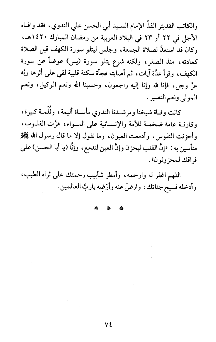 والكاتب الفديتر الفذ الإمام السيد ابي الحسن علي الندوي، فقد وافاه