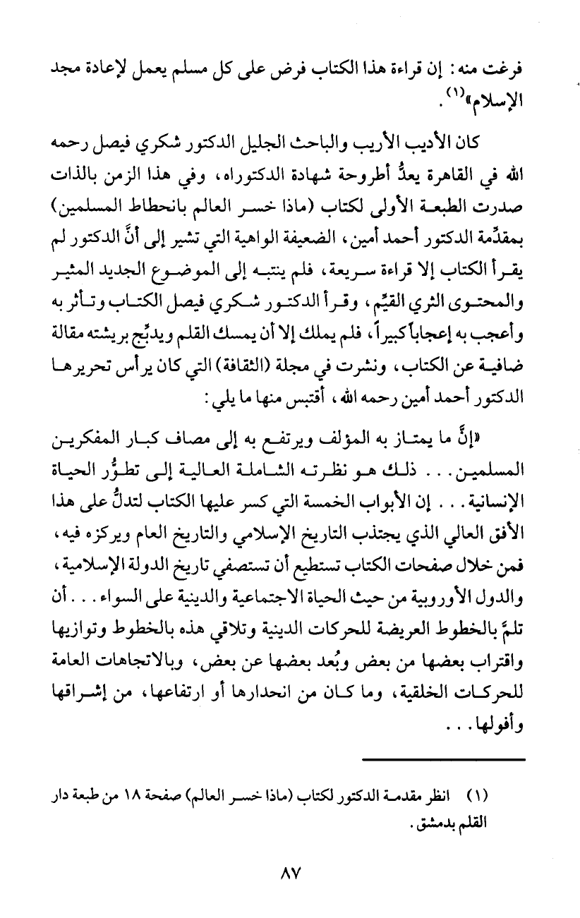 (1) انظر مقدمة الدكتور لكتاب (ماذا خسر العالم) صفحة 8 ا من طبعة دار
