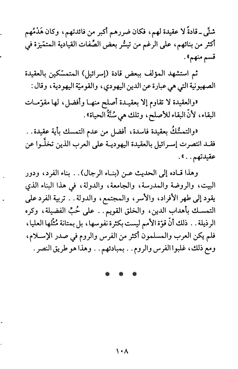 " والتمسُّكُ بعقيدة فاسدة، أفضل من عدم التمسك بأية عقيدة .. فقد انتصرت إسرائيل بالعقيدة اليهودية على العرب الذين تخلَّوا عن عقيدتهم .. ".