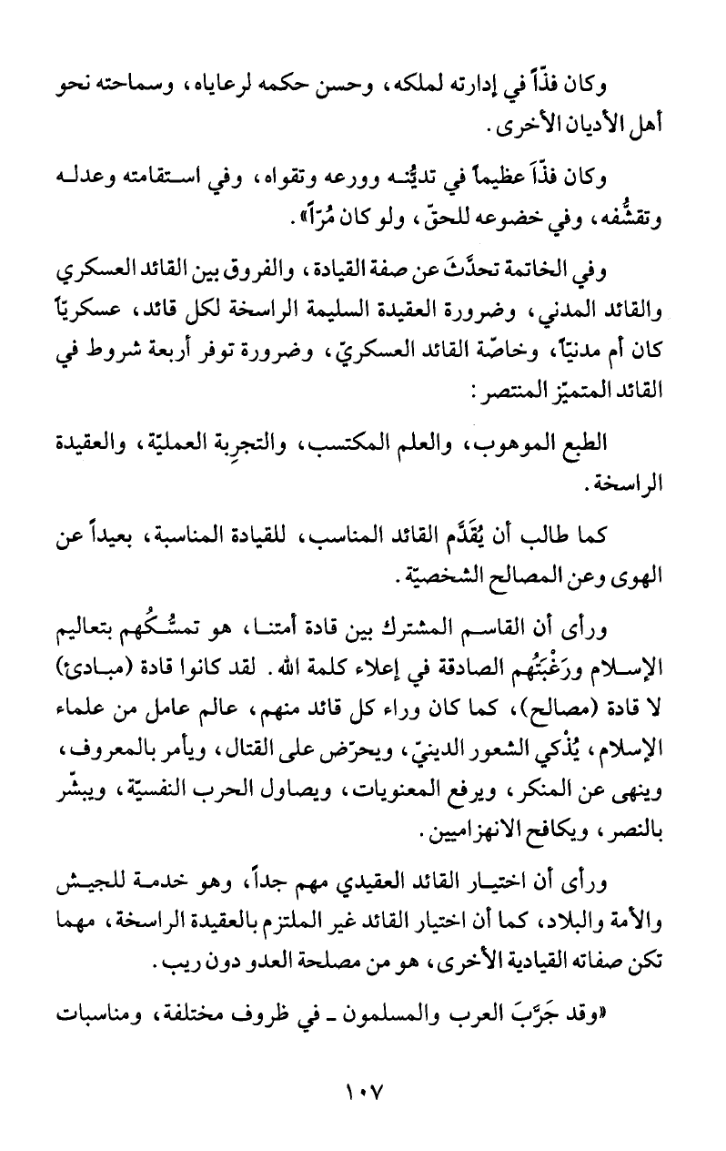 وفي الخاتمة تحدثَ عن صفة القيادة، والفروق بين القائد العسكري