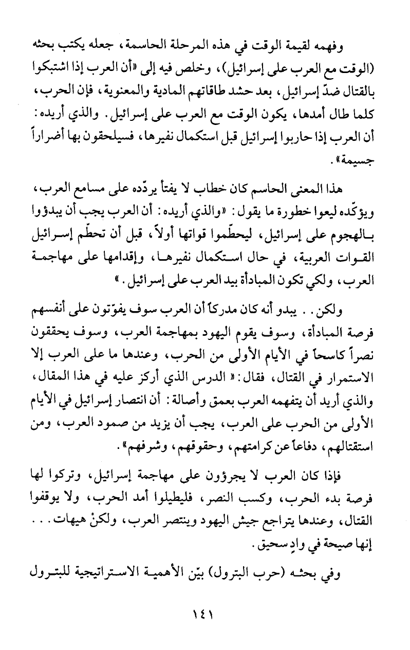 (الوقت مع العرب على إسرائيل)، وخلص فيه إلى " أن العرب إذا اشتبكوا