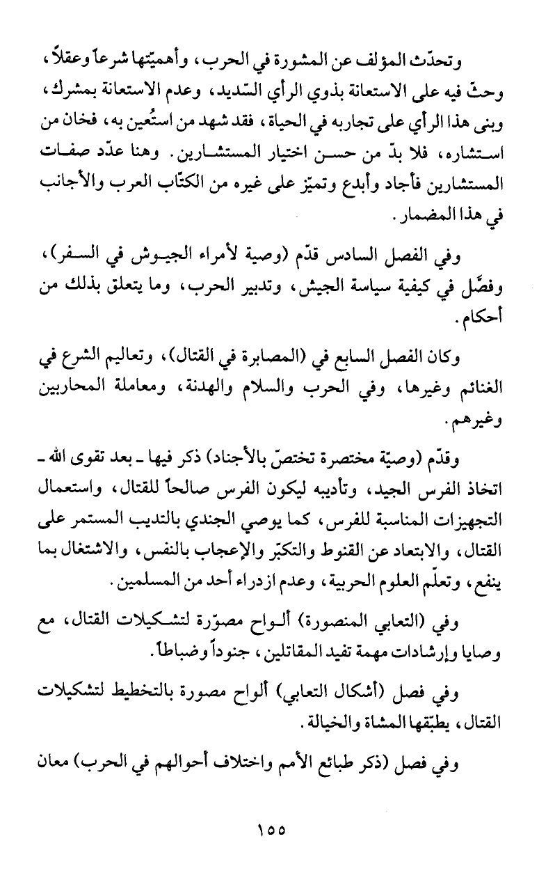 وتحدّث المؤلف عن المشورة في الحرب، وأهميّتها شرعأ وعقلاً،