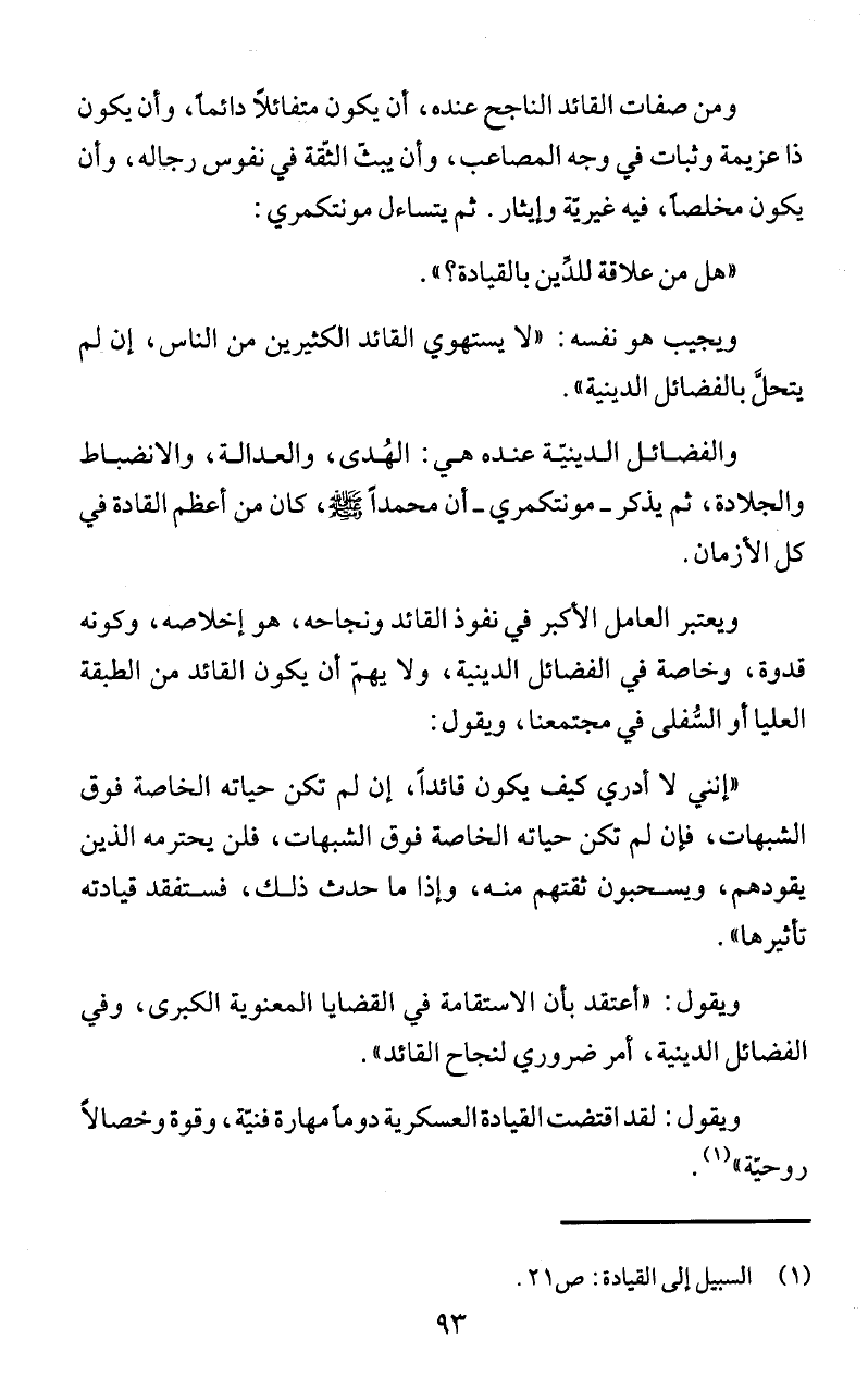 يكون مخلصأ، فيه غيرئة وإيثار. ثم يتساءل مونتكمري: