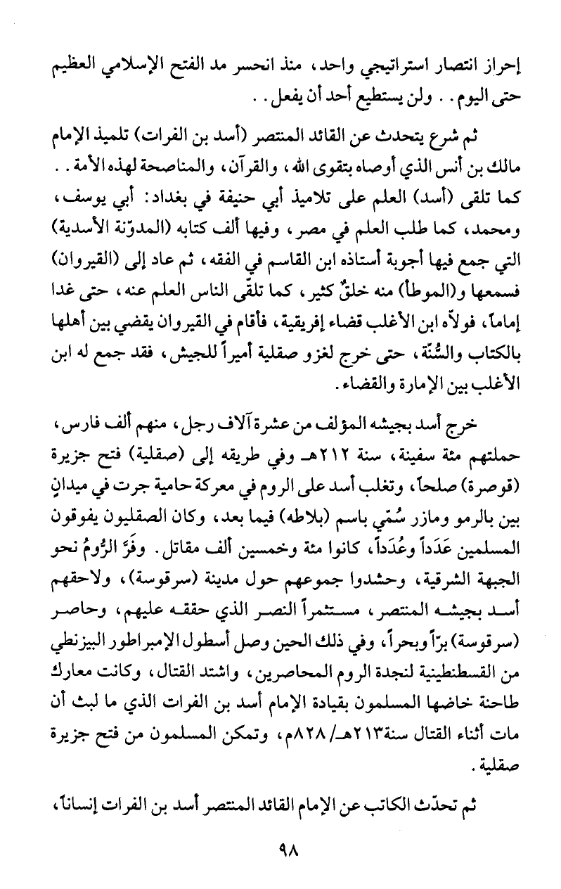 ئم شرع يتحدث عن القائد المنتصر (أسد بن الفرات) تلميذ الإمام