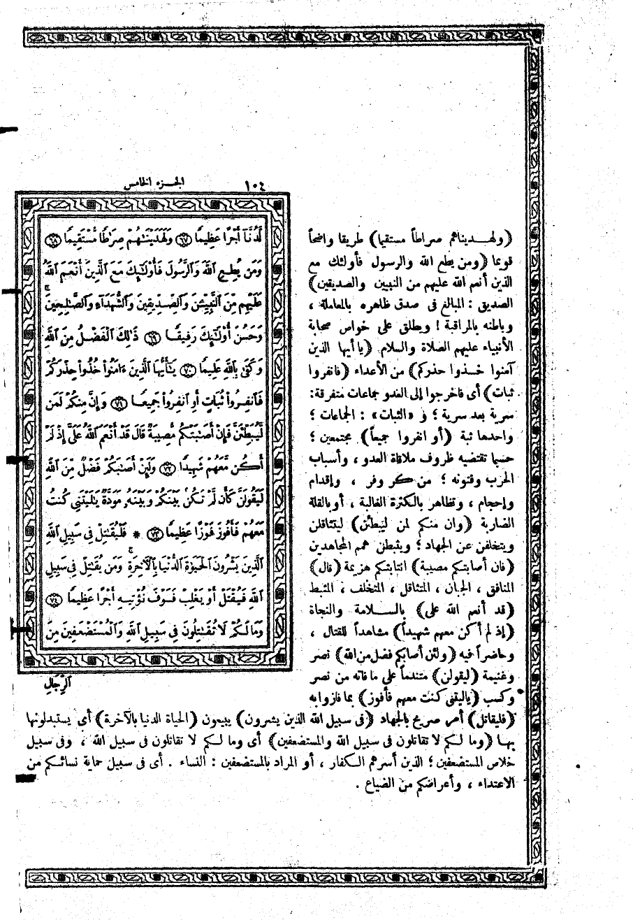 {وَإِنَّ مِنْكُمْ لَمَن لَّيُبَطِّئَنَّ} ليتثاقلن ويتخلفن عن الجهاد؛ ويثبطن همم المجاهدين {فَإِنْ أَصَابَتْكُمْ مُّصِيبَةٌ} انتابتكم هزيمة {قَالَ} المنافق، الجبان، المتثاقل، المتخلف، المثبط {قَدْ أَنْعَمَ اللَّهُ عَلَيَّ} بالسلامة والنجاة {إِذْ لَمْ أَكُنْ مَّعَهُمْ شَهِيداً} مشاهداً للقتال، وحاضراً فيه