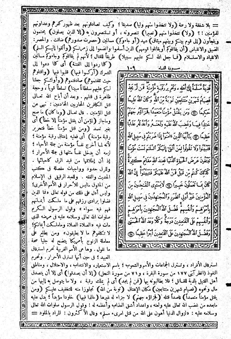 {وَمَا كَانَ} ما صح وما جاز {لِمُؤْمِنٍ أَن يَقْتُلَ مُؤْمِناً إِلاَّ خَطَئاً} أي بغير تعمد {وَمَن قَتَلَ مُؤْمِناً خَطَئاً فَتَحْرِيرُ رَقَبَةٍ مُّؤْمِنَةٍ} أي فعليه إعتاق رقبة مؤمنة؛ لأنه لما أخرج نفساً مؤمنة من جملة الأحياء؛ لزمه أن يدخل نفساً مثلها في جملة الأحرار؛ إذ أن إطلاقها من قيد الرق كإحيائها. وللرق حدود وواجبات مفصلة في كتب الحديث والفقه. وللعبد الرقيق في الإسلام من الحقوق ما ليس للأحرار في الأمم الأخرى؛ وليس أدل على ذلك من قوله تعالى: {فَمَا الَّذِينَ فُضِّلُواْ بِرَآدِّي رِزْقِهِمْ عَلَى مَا مَلَكَتْ أَيْمَانُهُمْ فَهُمْ فِيهِ سَوَآءٌ} وقول الرسول الكريم صلوات الله تعالى وسلامه عليه في مرضه الذي مات فيه «الصلاة الصلاة وما ملكت أيمانكم؛ لا تكلفوهم ما لا يطيقون» ومن يطلع على معاملة الزنوج بأمريكا يتضح له جلياً صحة ما نقول. وها هي الأمم الغربية تحرم استرقاق العبيد؛ في حين أنها تسترق الأحرار. وتحرم استرقاق الأفراد، وتسترق الجماعات والأمم والشعوب؛ باسم الاستعمار، والانتداب، والاحتلال، ومناطق النفوذ (انظر آيتي 177 من سورة البقرة، و7صلى الله عليه وسلّم من سورة النحل)
