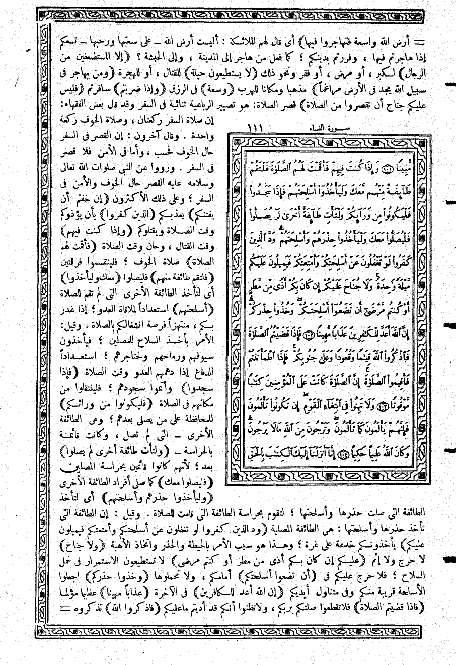 -[112]- وراقبوه {قِيَاماً وَقُعُوداً وَعَلَى جُنُوبِكُمْ} أي في سائر حالاتكم؛ ليعينكم على عدوكم {فَإِذَا اطْمَأْنَنتُمْ} وزال خوفكم من أعدائكم {فَأَقِيمُواْ الصَّلاَةَ} كاملة {إِنَّ الصَّلاَةَ كَانَتْ عَلَى الْمُؤْمِنِينَ كِتَاباً مَّوْقُوتاً} فرضاً واجباً؛ محدوداً بأوقات معلومة