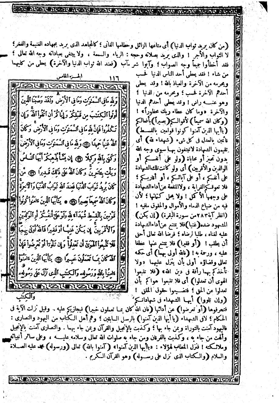 {يَاأَيُّهَا الَّذِينَ آمَنُواْ كُونُواْ قَوَّامِينَ بِالْقِسْطِ} قائمين بالعدل في كل شيء {شُهَدَآءِ للَّهِ} أي تقيمون الشهادة لا تبتغون بها سوى وجه الله بدون تحيز أو محاباة {وَلَوْ عَلَى أَنْفُسِكُمْ أَوِ الْوَالِدَيْنِ وَالأَقْرَبِينَ} أي ولو كانت تلك الشهادة على أنفسكم، أو على آبائكم، أو أقاربكم؛ فلا تعوقكم القرابة، ولا المنفعة عن أداء الشهادة على وجهها الأكمل ولا يحل كتمانها؛ لأن فيه من ضياع الدماء والأموال والحقوق ما فيه (انظر آية 283 من سورة البقرة) {إِن يَكُنْ} المشهود ضده فلا يمتنع عن أداء الشهادة عليه لغناه، طلبا لرضاه؛ فرضا الله تعالى أحق أن يطلب {أَوْ فَقَيراً} فلا يمتنع عنها عطفاً عليه، ورحمة به {فَاللَّهُ أَوْلَى بِهِمَا} أي حكمه تعالى وقضاؤه أولى بأن ينزل عليهما {وَلاَ تَأْخُذْكُمْ بِهِمَا رَأْفَةٌ فِي دِينِ اللَّهِ} {فَلاَ تَتَّبِعُواْ الْهَوَى أَن تَعْدِلُواْ} أي فلا تتبعوا هواكم بأن تعدلوا عن الحق؛ فتضيعوا حقوق الخلق {وَإِن تَلْوُواْ} أيها الشهداء في شهاداتكم فتحرفوها {أَوْ تُعْرِضُواْ} عن أدائها {فَإِنَّ اللَّهَ كَانَ بِمَا تَعْمَلُونَ خَبِيراً} فيجازيكم عليه. وقيل نزلت الآية في الحكام؛ لا في الشهداء {يَاأَيُّهَا الَّذِينَ آمَنُواْ} بالرسل السابقين؛ وهم أهل الكتاب من اليهود والنصارى: فاليهود آمنت بالتوراة وبمن جاء بها؛ وكذبت بالإنجيل والقرآن وبمن جاء بهما. والنصارى آمنت بالإنجيل وألهت من جاء به، وكذبت بالفرقان ومن جاء به صلوات الله تعالى وسلامه عليه، وعلى سائر أنبيائه وملائكته فنزل الخطاب لهؤلاء: