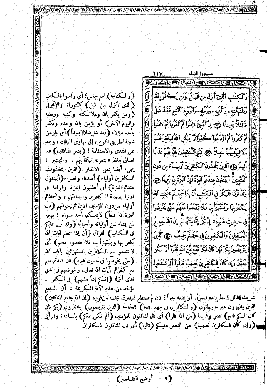 {وَقَدْ نَزَّلَ عَلَيْكُمْ فِي الْكِتَابِ} القرآن {أَنْ إِذَا سَمِعْتُمْ آيَاتِ اللَّهِ يُكَفَرُ بِهَا وَيُسْتَهْزَأُ بِهَا فَلاَ تَقْعُدُواْ مَعَهُمْ} أي لا تقعدوا مع الكافرين المستهزئين بآيات الله {حَتَّى يَخُوضُواْ فِي حَدِيثٍ غَيْرِهِ} فإن قعدتم معهم مع كفرهم بآيات الله تعالى، وخوضهم في الحق الذي أنزله {إِنَّكُمْ إِذاً مِّثْلُهُمْ} في الكفر. يؤخذ من هذه الآية الكريمة: أن السامع شريك للقائل؛ ما لم يرده قسراً، أو يمنعه جبراً؛ فإن لم يستطع فليفارق مجلسه من فوره {إِنَّ اللَّهَ جَامِعُ الْمُنَافِقِينَ} الذين يظهرون غير ما يبطنون {وَالْكَافِرِينَ فِي جَهَنَّمَ جَمِيعاً} للعذاب