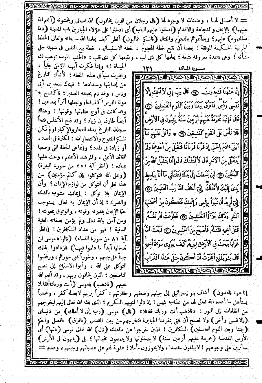 {قَالَ رَجُلاَنِ مِنَ الَّذِينَ يَخَافُونَ} الله تعالى ويخشونه {أَنْعَمَ اللَّهُ عَلَيْهِمَا} بالإيمان والشجاعة والإقدام {ادْخُلُواْ عَلَيْهِمُ الْبَابَ} أي ادخلوا على هؤلاء الجبارين باب المدينة {فَإِذَا دَخَلْتُمُوهُ} عليهم؛ وبدأتموهم بالهجوم والقتال {فَإِنَّكُمْ غَالِبُونَ} أنظر كيف يعلمنا الله سبحانه وتعالى الخطط الحربية الحكيمة الموفقة: يعلمنا أن نتبع خطة الهجوم، خطة الاستبسال، خطة بيع النفس في سبيله جل شأنه وهي قاعدة معروفة متبعة؛ يعلمها كل ذي لب، ويتبعها كل ذي قلب: «اطلب الموت توهب لك الحياة» وإذا فكرت أيها المؤمن جلياً، ونظرت ملياً في هذه الخطة؛ لأنبأك التاريخ عن إصابتها وسدادها؛ فهناك سعدبن أبي وقاص، وقد قام بجيشه الصغير؛ فاكتسح به دولة الفرس اكتساحاً، وجعلها أثراً بعد عين؛ وقد كانت في أوج عظمتها وقوتها وهناك أيضاً طارقبن زياد؛ وقد فتح الأندلس فتحاً سجله له التاريخ بمداد الفخار والإكبار ولم تكن تلكم الفتوح والانتصارات: لكثرة في العدد، أو زيادة في المدد؛ وإنما هي الخطة التي وضعها القائد الأعلى، والمرشد الأعظم، وحث عليها عباده (انظر آية 251 من سورة البقرة)